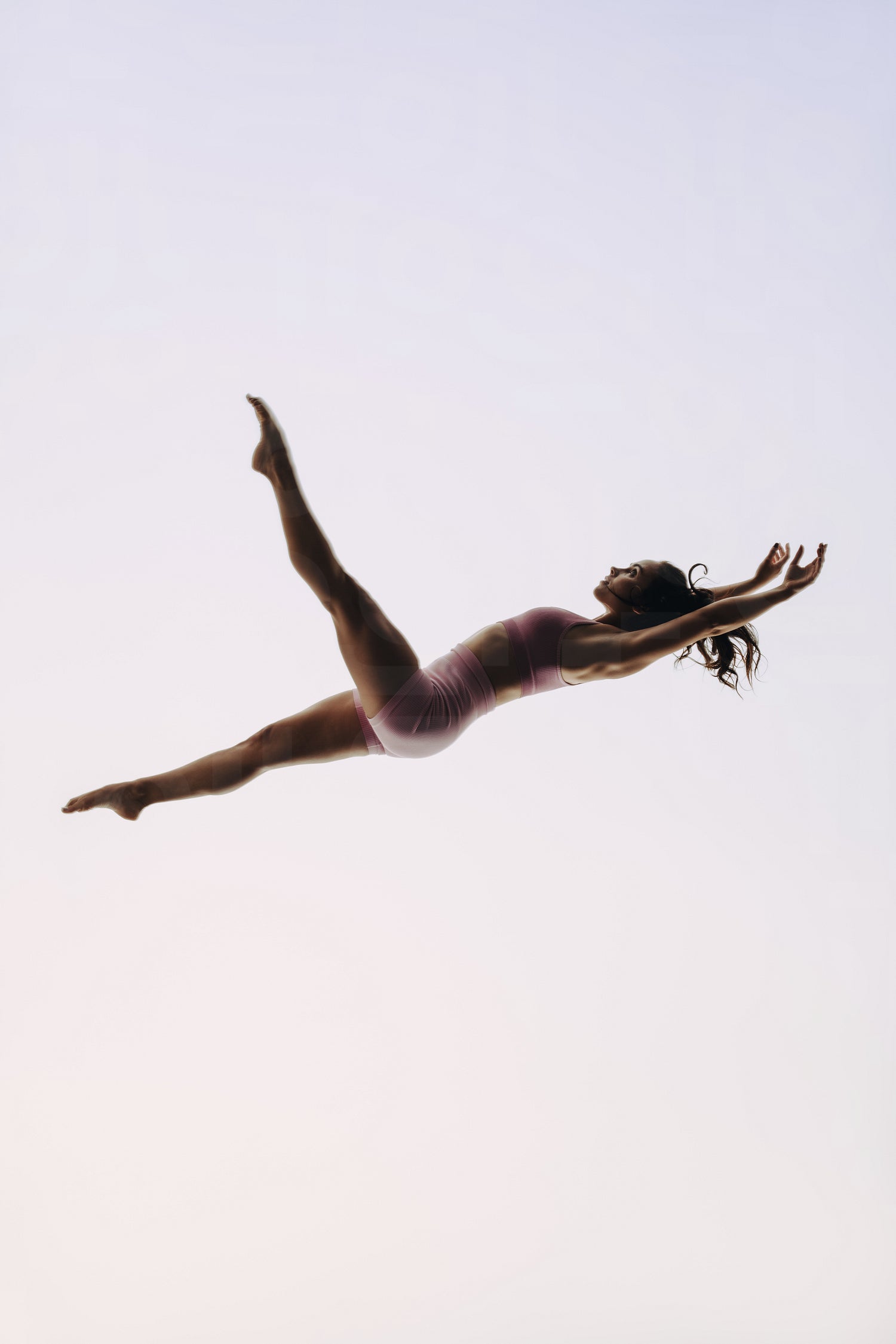 Female athlete demonstrates her agility and flexibility with professional technique in acrobatics and gymnastics. Suspended in mid-air, she balances with impressive skill and lean physique, creating a dynamic and artistic motion.