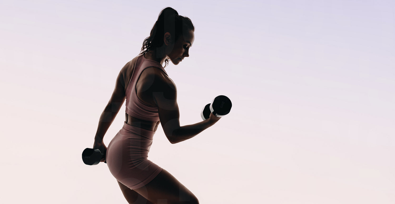 Woman in fitness clothing engages in weight training and bodybuilding, demonstrating proper form and muscular strength. Athletic woman lifting dumbbells in a studio, silhouetted against a pink background.