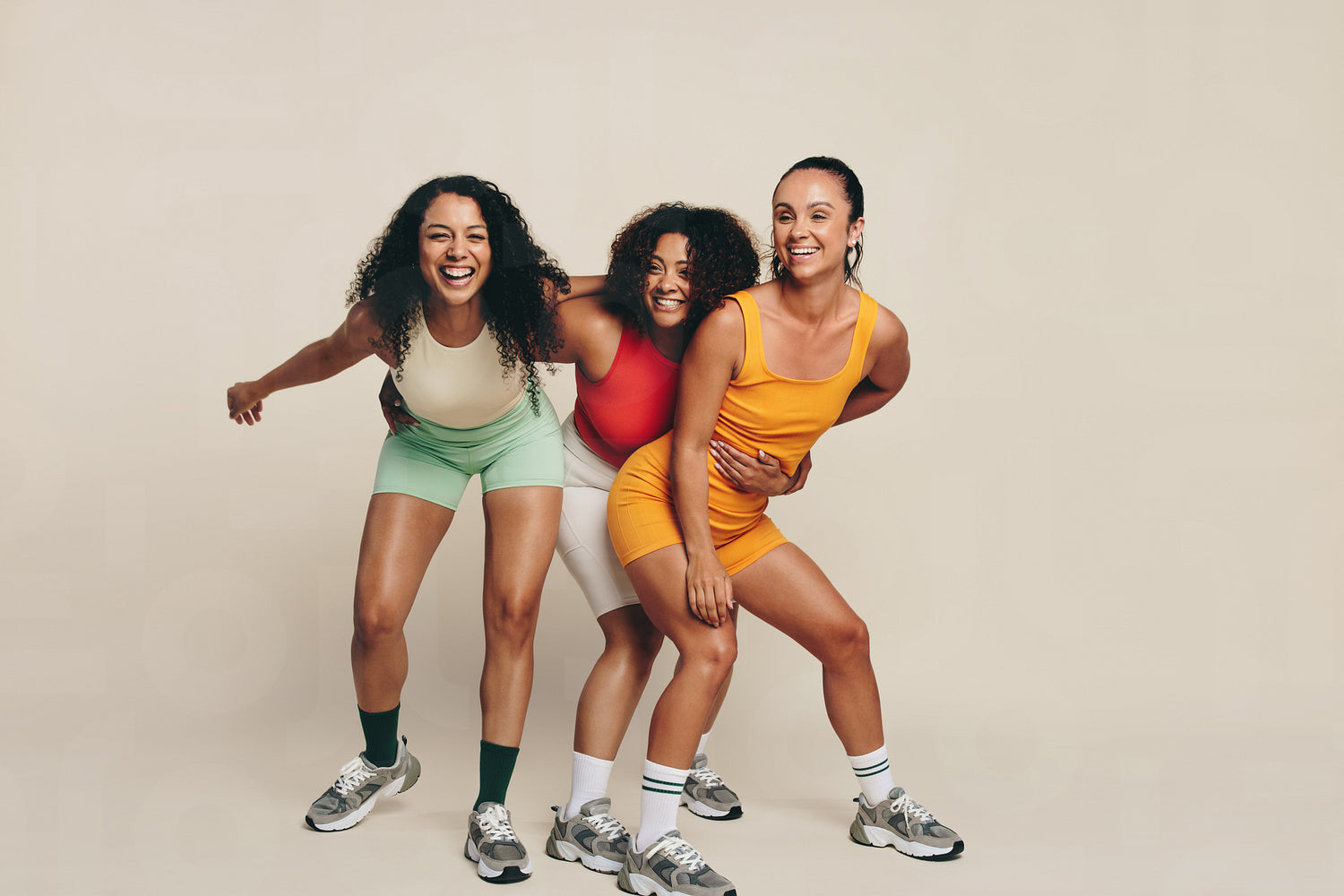 Fitness fun: Group of happy female athletes laughing in sportswear