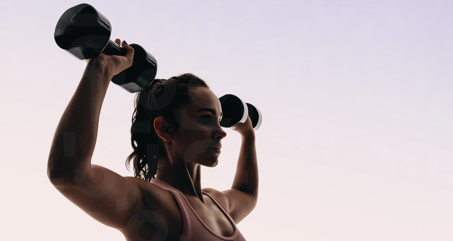 Fit woman in sportswear trains her upper body in a studio, lifting weights and using dumbbells. Her silhouette showcases her toned physique and dedication to her fitness routine.