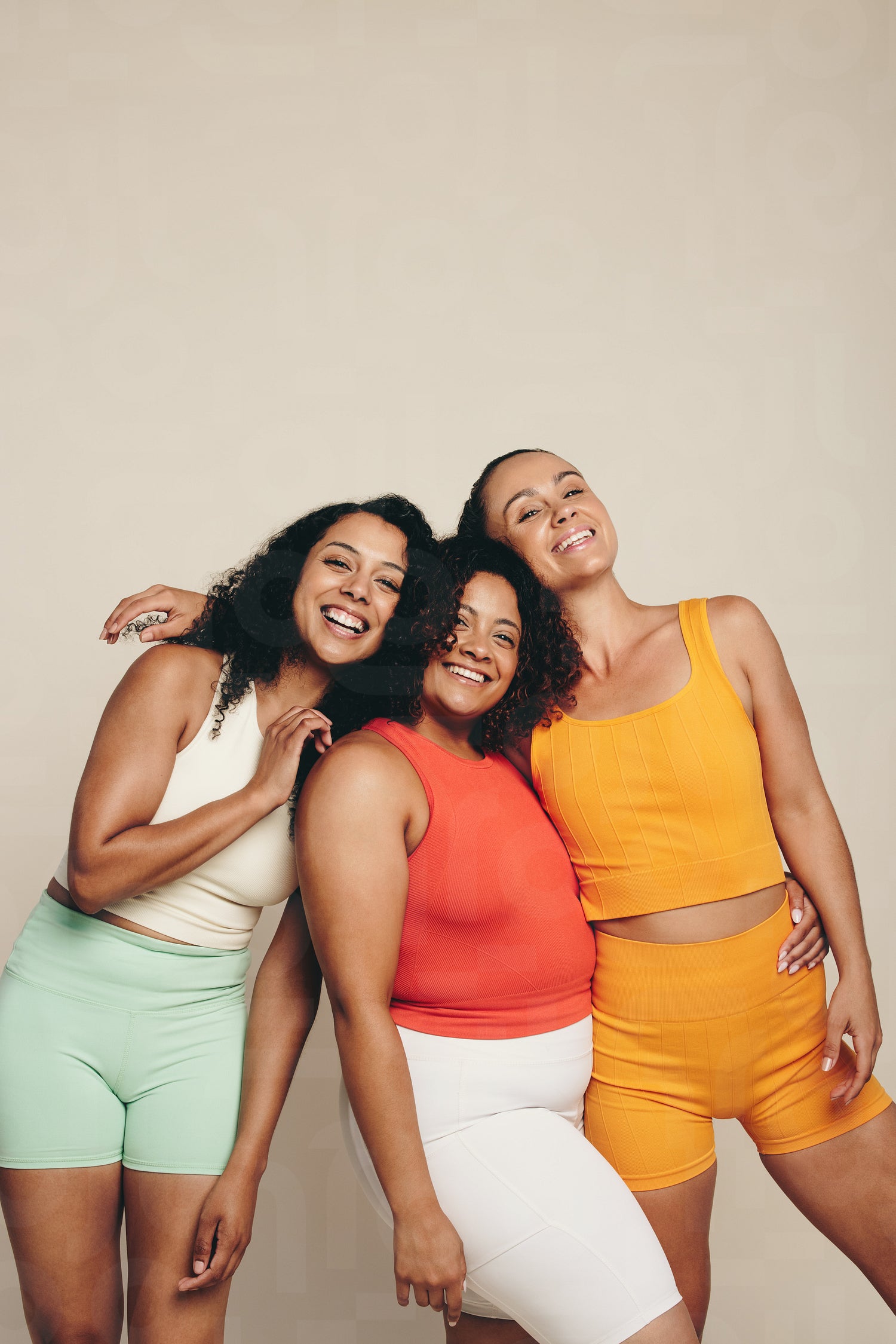 Group of sporty women smiling at the camera, standing in a studio in fitness clothing. Three young female friends embracing a lifestyle of sport, exercise and body fitness.