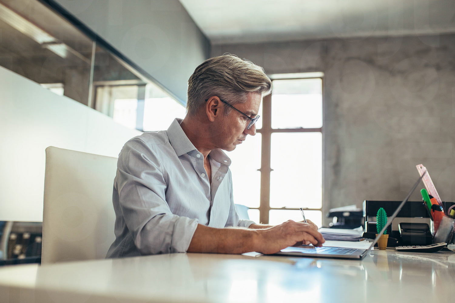 Mature businessman working at his desk. Male executive making notes while working on laptop in office.