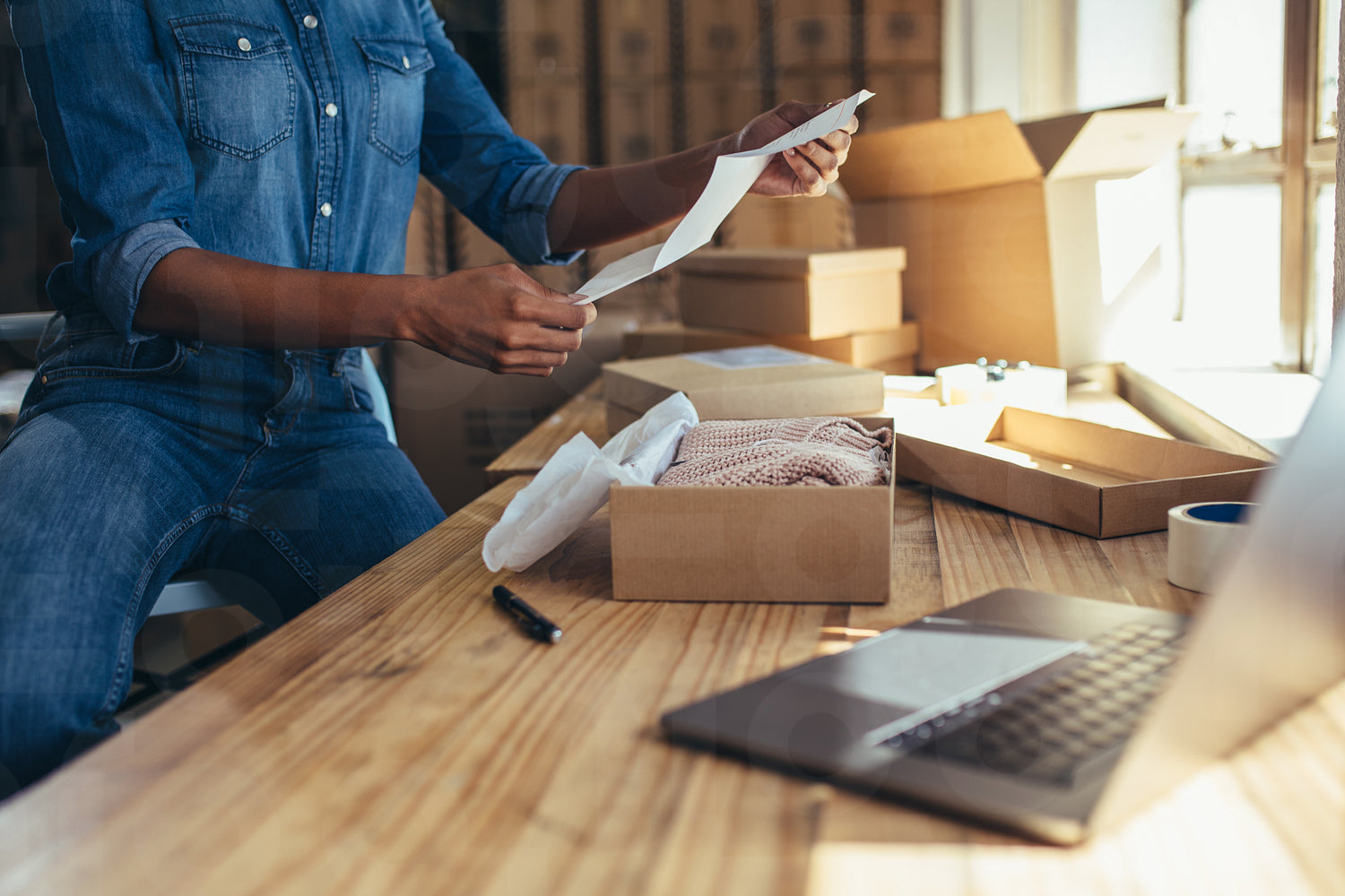 Woman reading and verifying the invoice before shipping the product to the customer. Cropped shot of female preparing shipment for delivery at her desk.