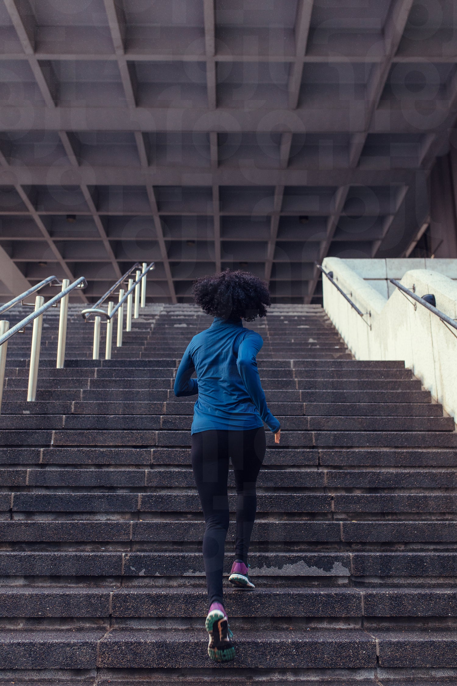 Woman running up the stairs of a building. Woman athlete climbing stairs as part of her physical training.