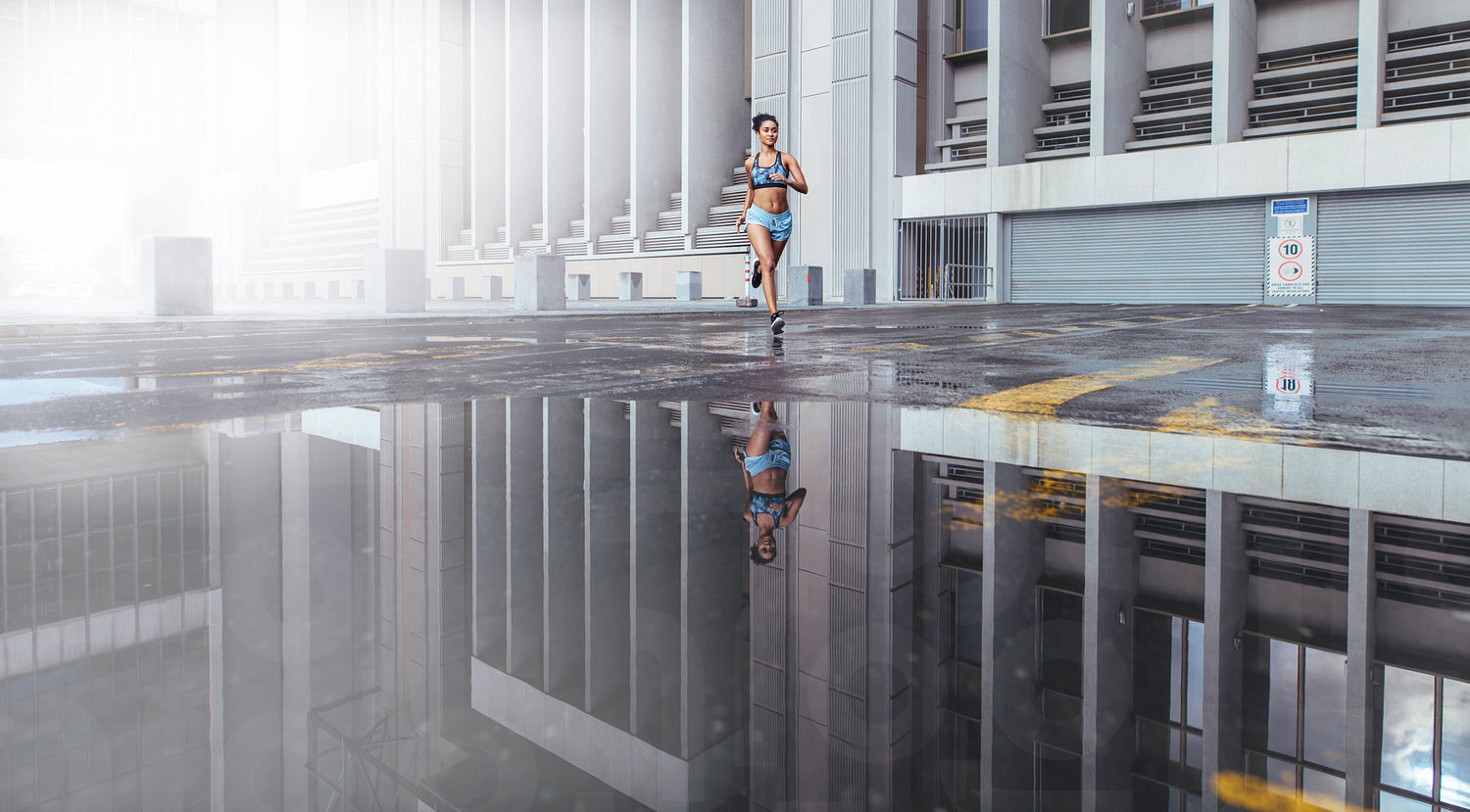 Woman athlete running outdoors in the morning. Reflection of woman runner on water surface in front of a large city building.