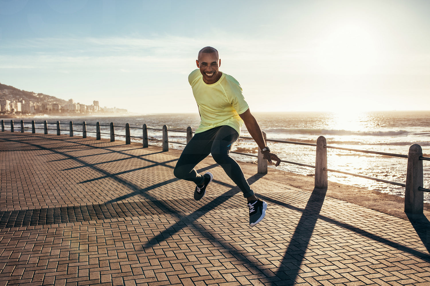 Young african man jumping on a road by the sea. Excited young runner jumping.
