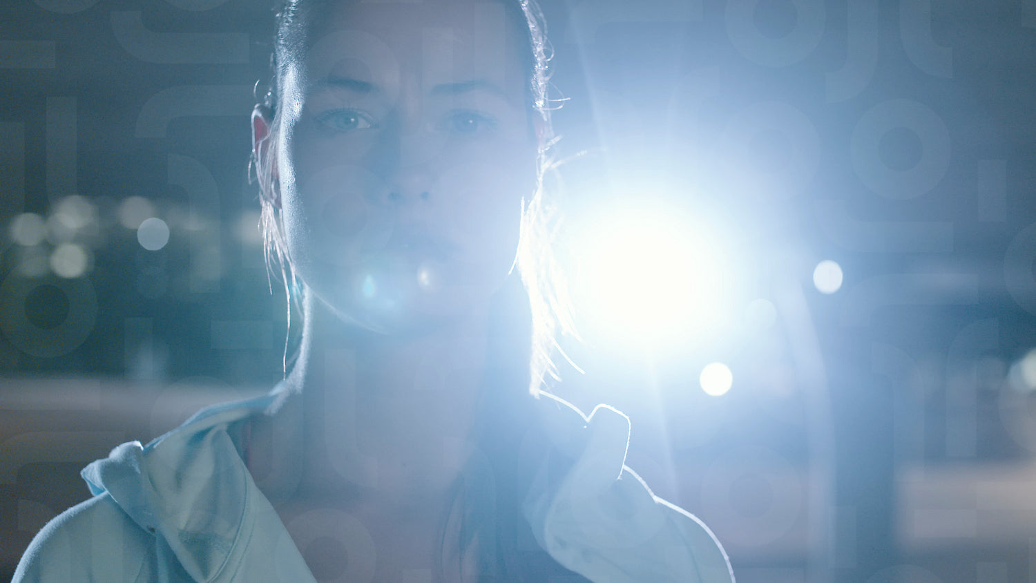 Bright street light shining behind fitness woman standing outdoors in the city. Urban female runner standing under bridge at night and staring at camera.