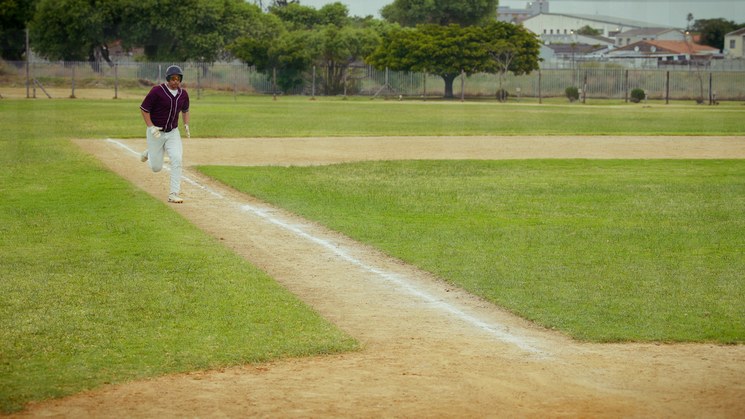 A determined baseball player runs and executes a perfect slide into home plate, kicking up a cloud of dust. The catcher watches the dynamic play unfold on the field.