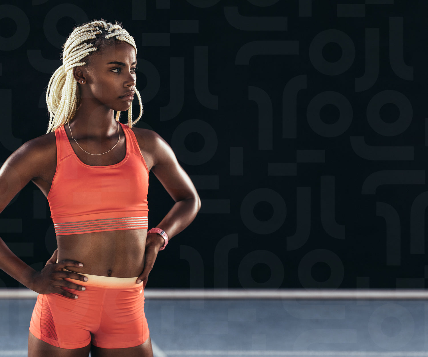 Woman athlete in fitness attire standing on running track with hands on hip looking away. Female athlete standing on track on a black background.