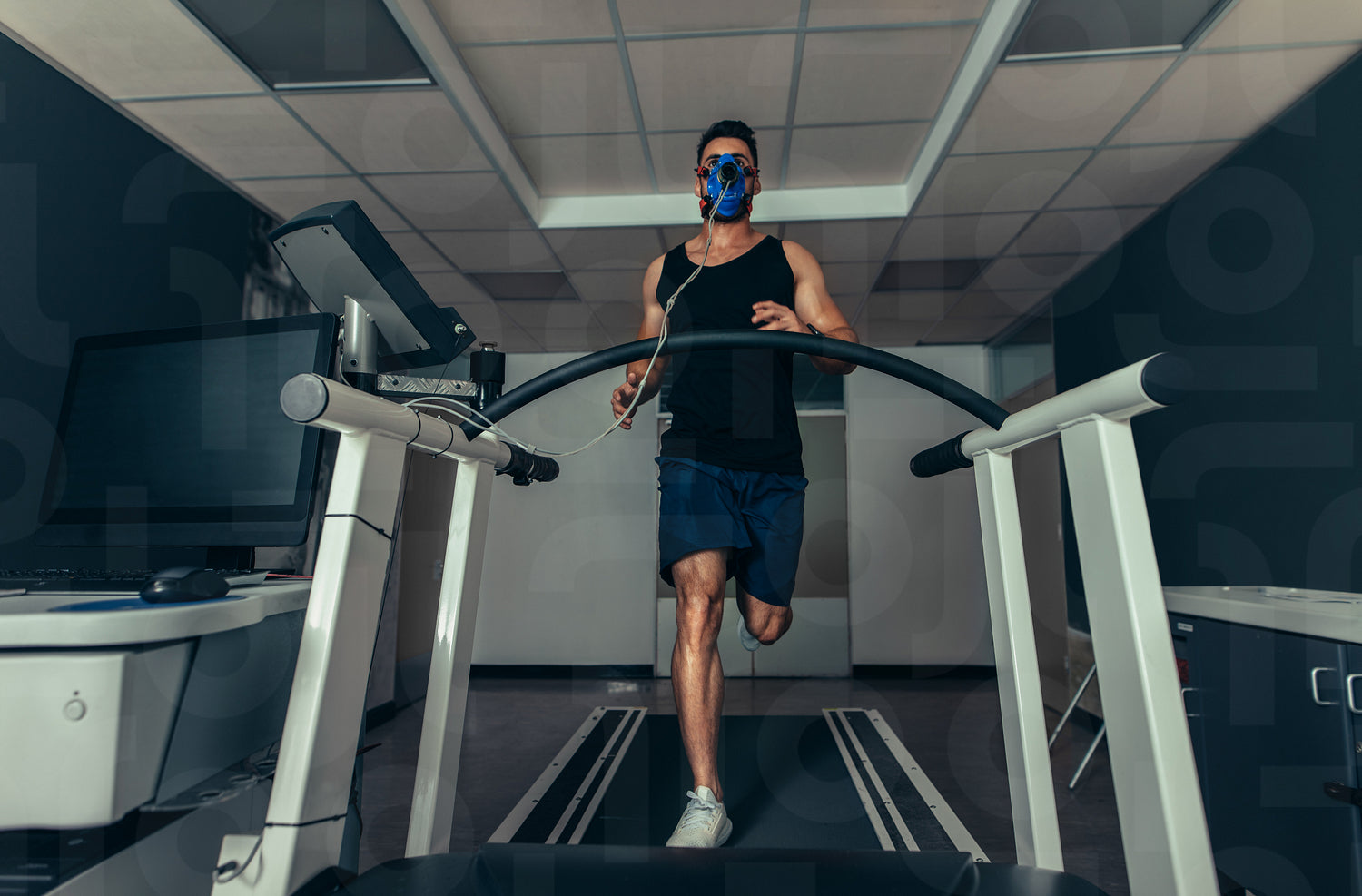 VO2 max test. Fit young man running fast on treadmill with a mask. Athlete examining his performance in sports science lab.