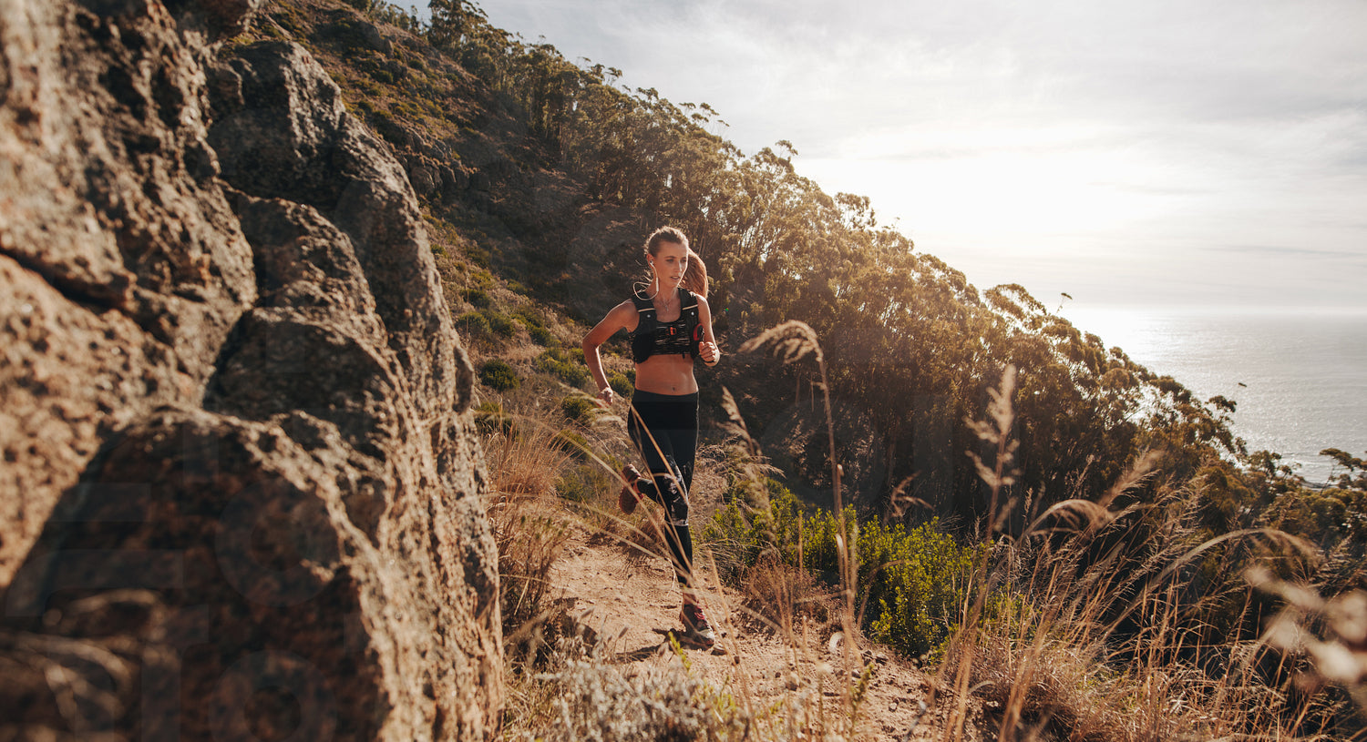 Woman running over extreme terrain on the hillside. Female runner training outdoors on rocky mountain trail.