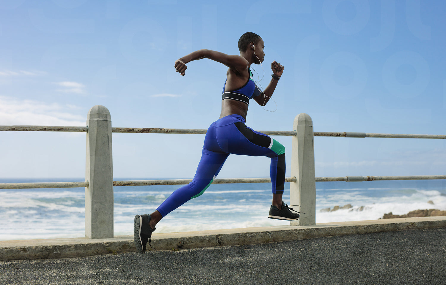 Full length shot of a woman runs on seaside road. Fit female athlete sprinting on seaside promenade in morning.