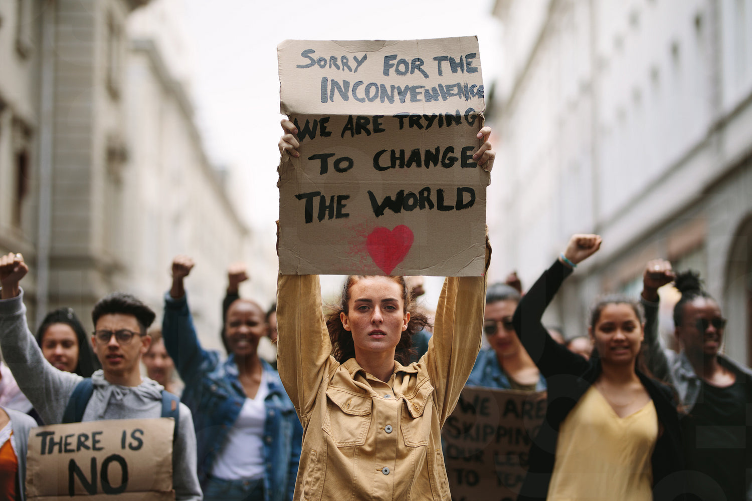 Young student holding poster and protesting. Group of demonstrators making protest about climate change.