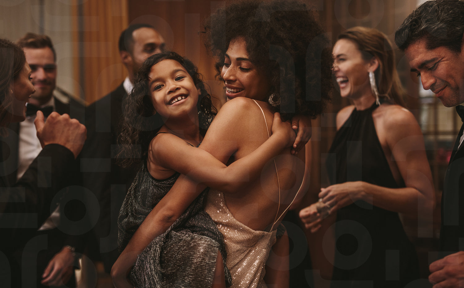 Girl dancing with her mother at a gala night event. Woman carrying her daughter and dancing at new years party with people enjoying around.