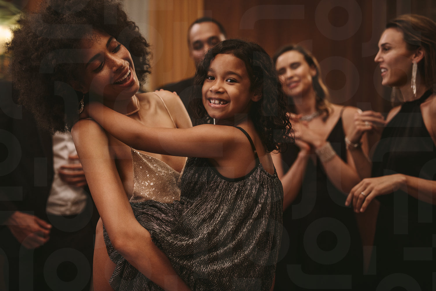 Mother and daughter dancing and having fun at a party with people dancing around them. Beautiful african woman dancing with her cute girl at gala night.