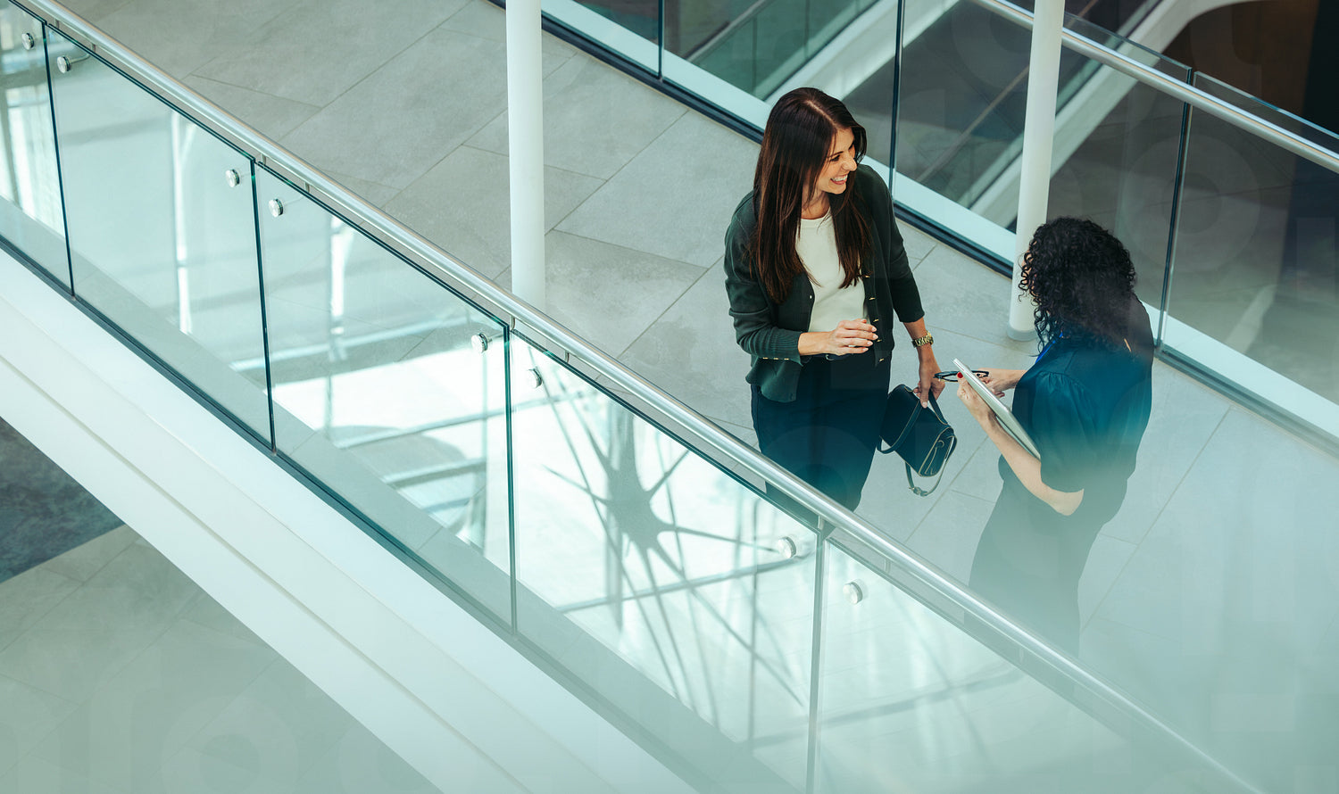 Two businesswomen engage in a friendly conversation while walking through a modern office building. They are discussing work-related topics, reflecting a productive and positive office culture.