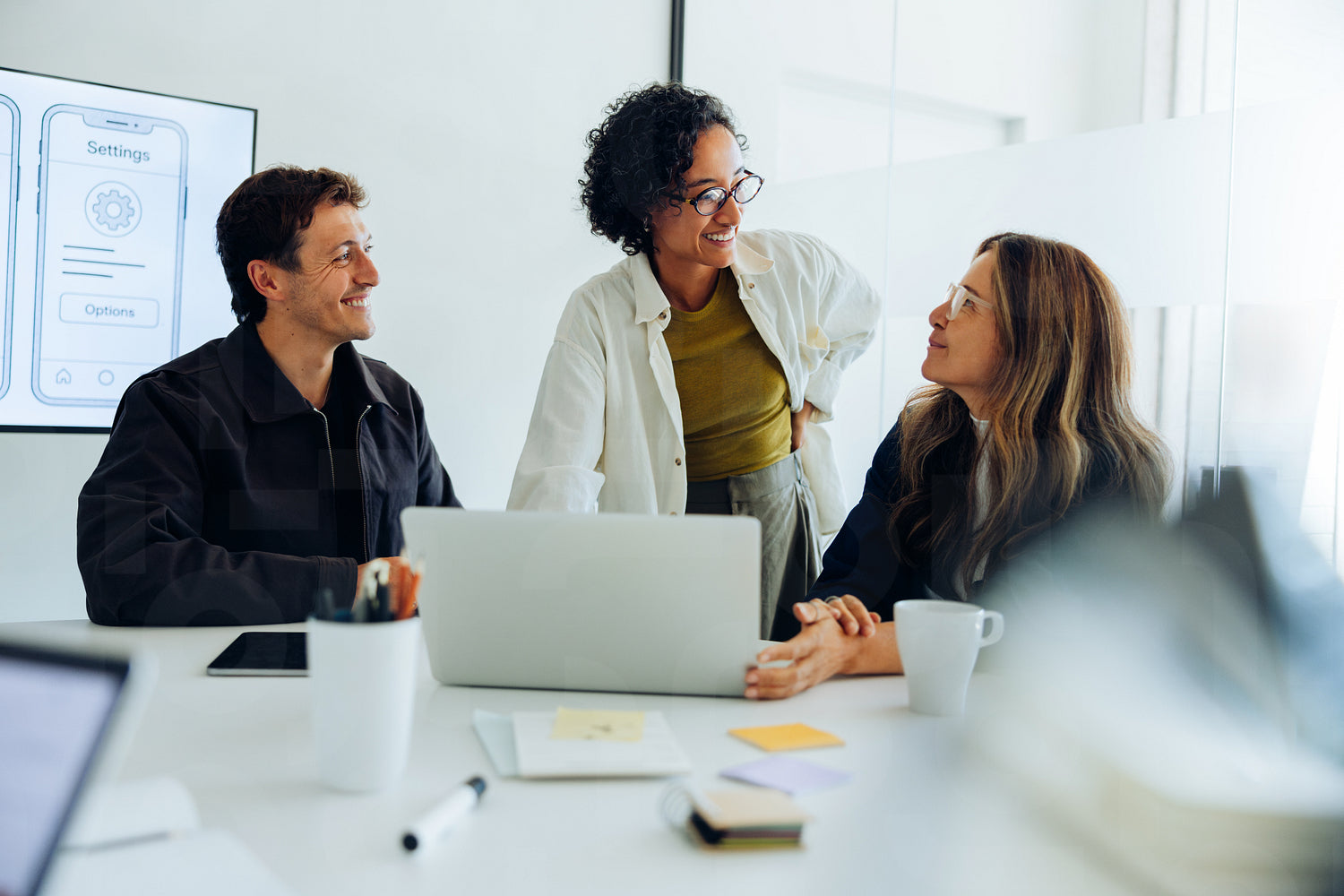 A small design team gathers around a table reviewing ideas on a laptop, sharing feedback and smiling as they collaborate on UX strategy, problem-solving, and creative planning in a modern workplace.