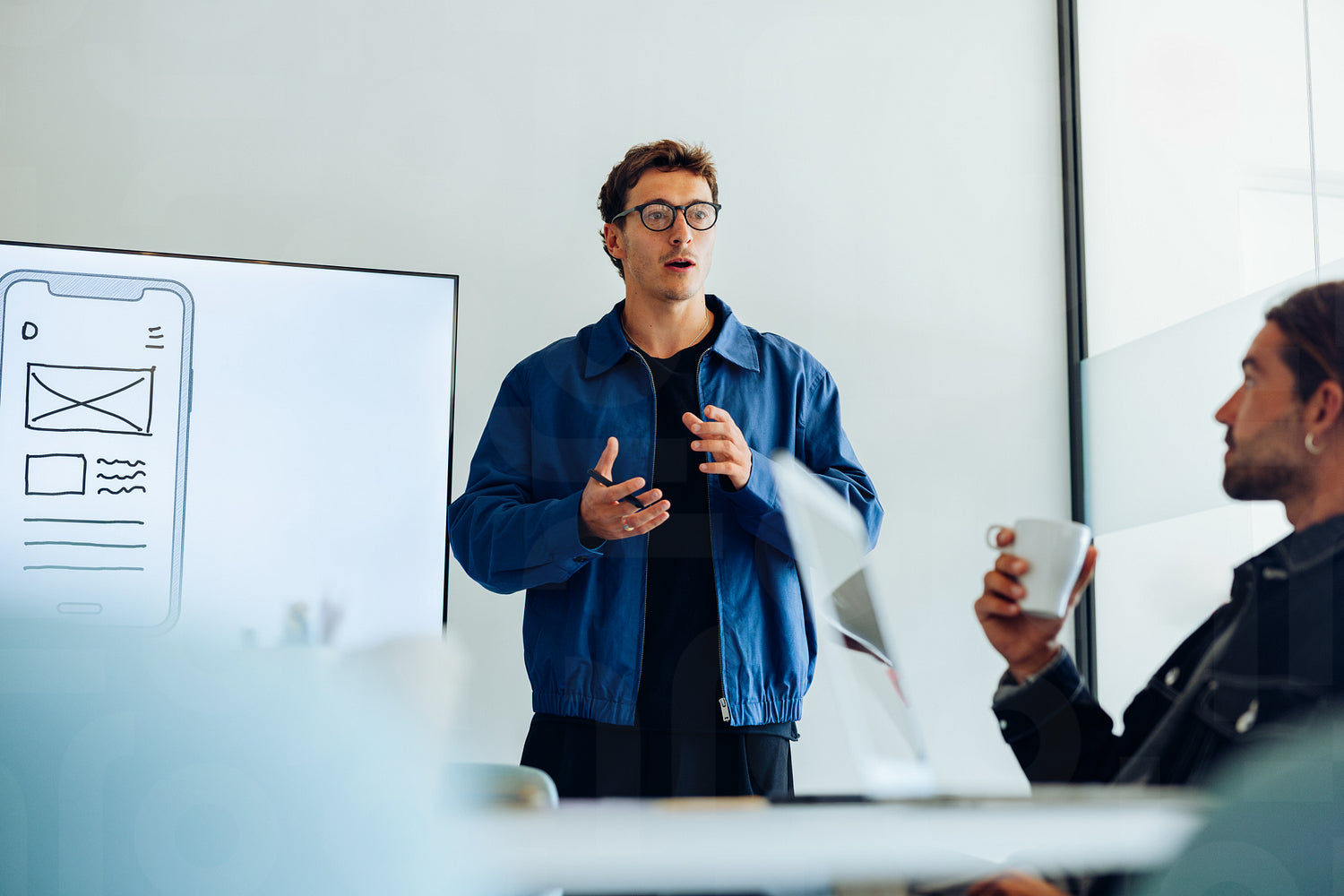 A male UX designer presents mobile app wireframes and user flow concepts to colleagues during a collaborative meeting.