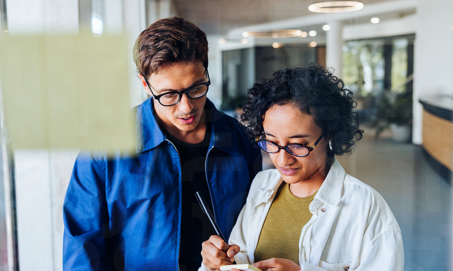 A man and a woman wearing glasses review notes on a notebook in a sleek office, focusing on ideas. They discuss details in a collaborative, professional moment that highlights teamwork and communication.
