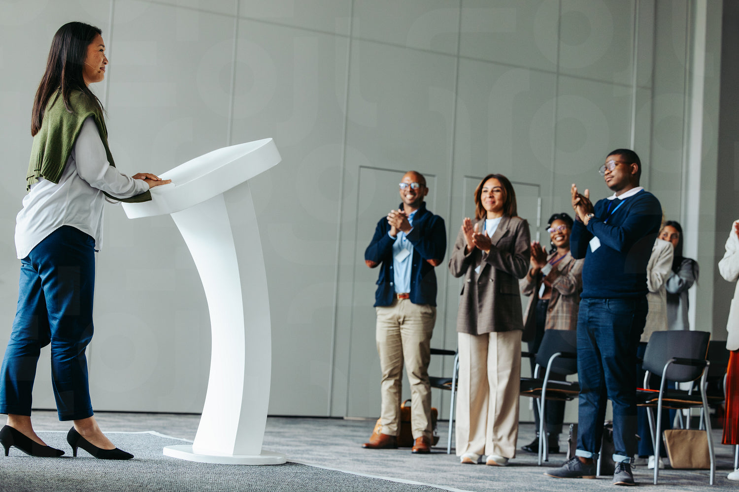 Female leader giving a business presentation at a conference event, receiving applause from the audience