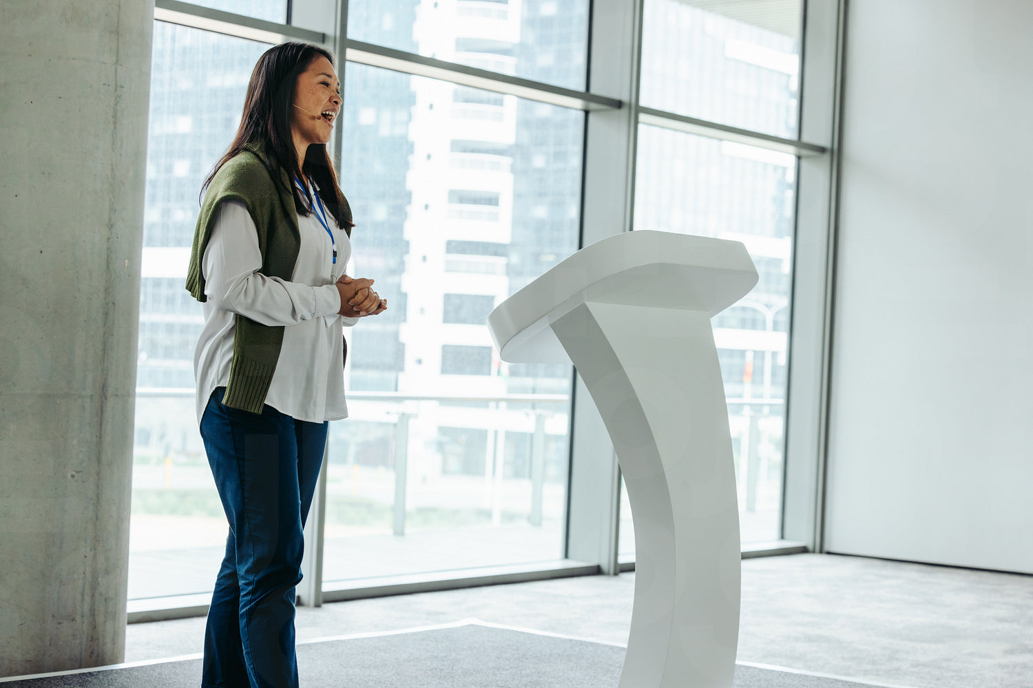 Female speaker giving a presentation during a business seminar, focusing on leadership and training in a modern conference room.