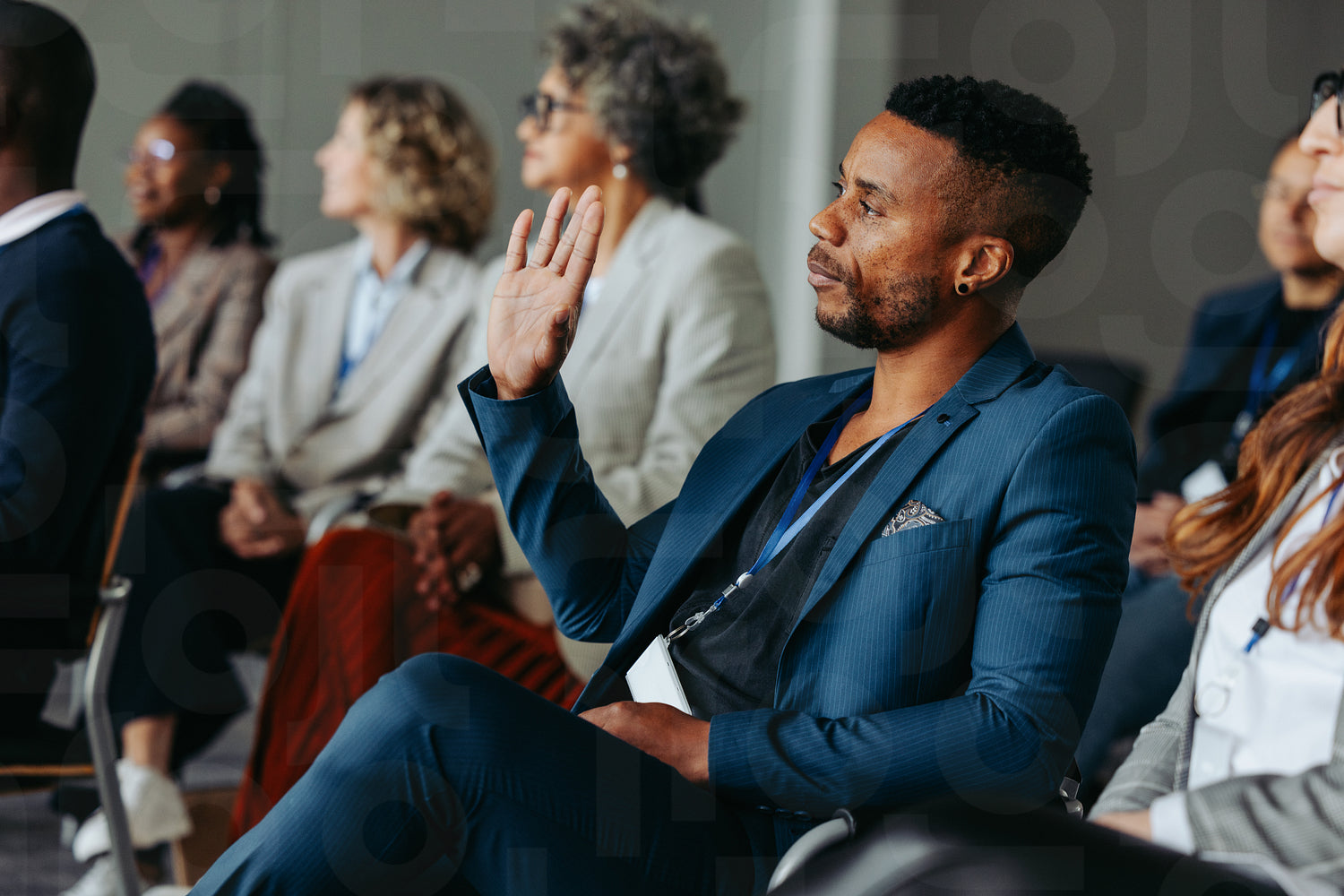 Businessman raising his hand during a conference presentation attended by a diverse group, showing interest and engagement by asking a question.