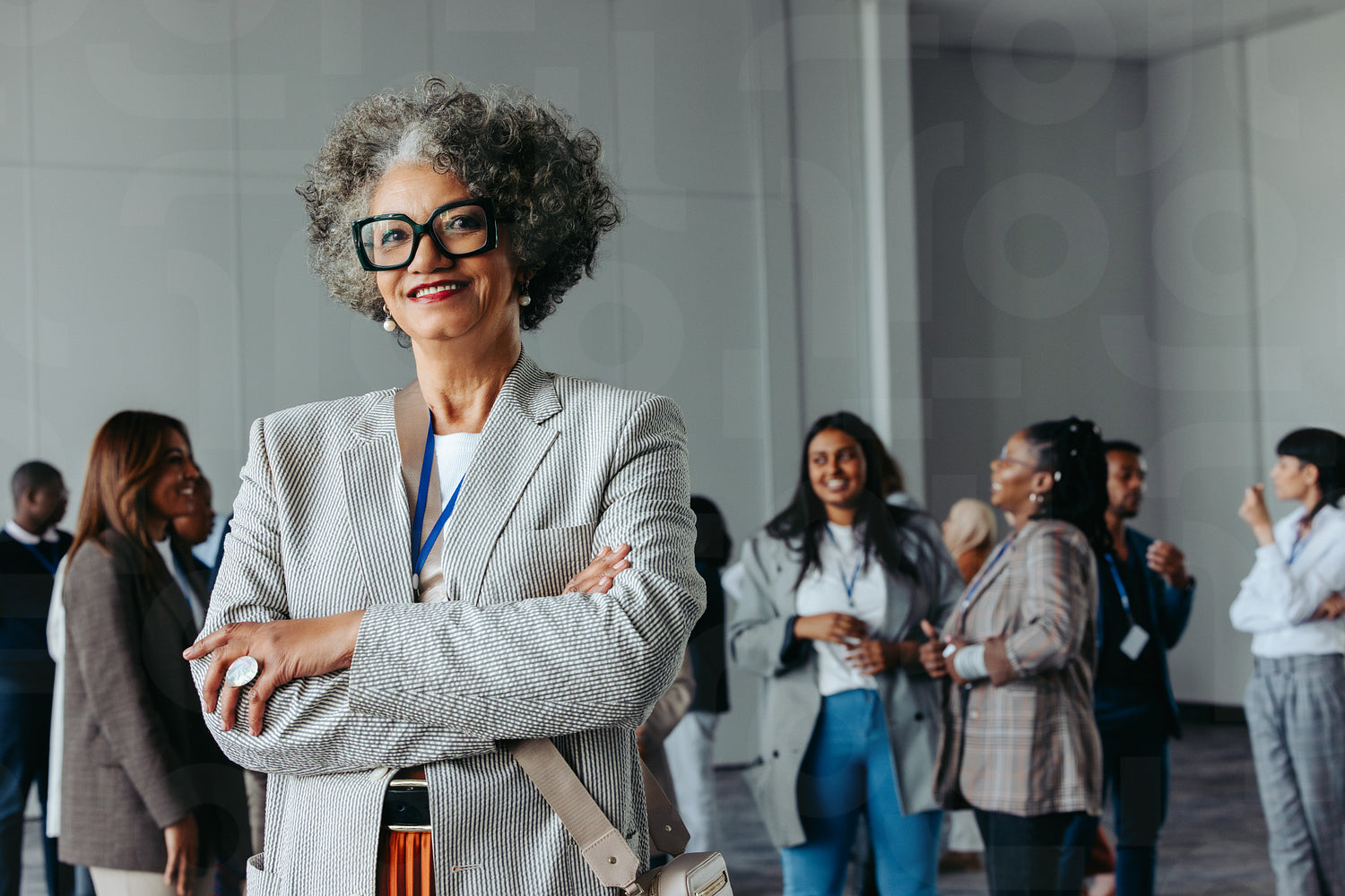 Confident mature female professional at a corporate business conference, standing and smiling with diverse colleagues in the background engaged in conversation.