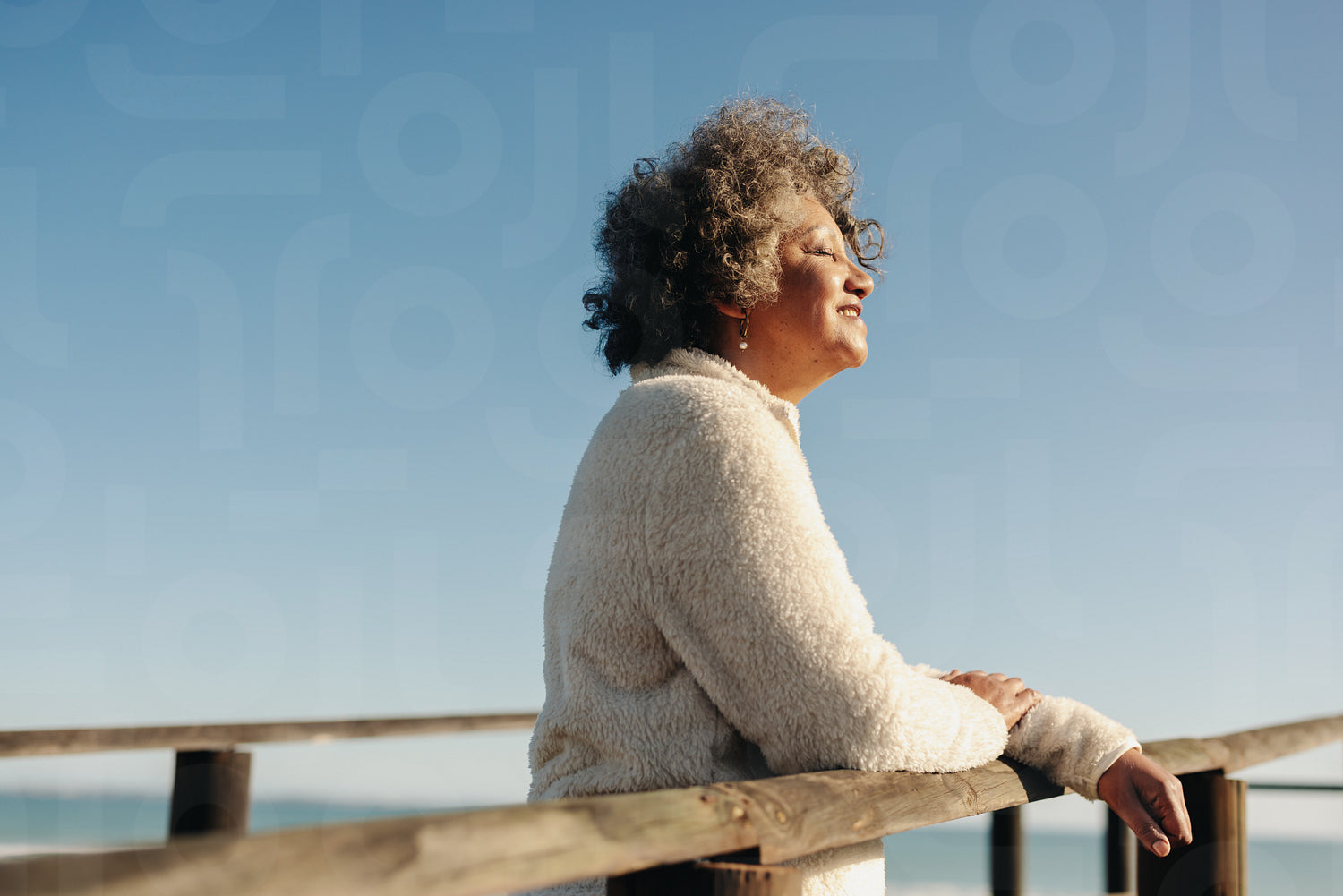 Enjoying the sun at the beach. Happy senior woman getting some sunlight while standing on a boardwalk next to the ocean. Cheerful elderly woman taking a refreshing holiday after retirement.
