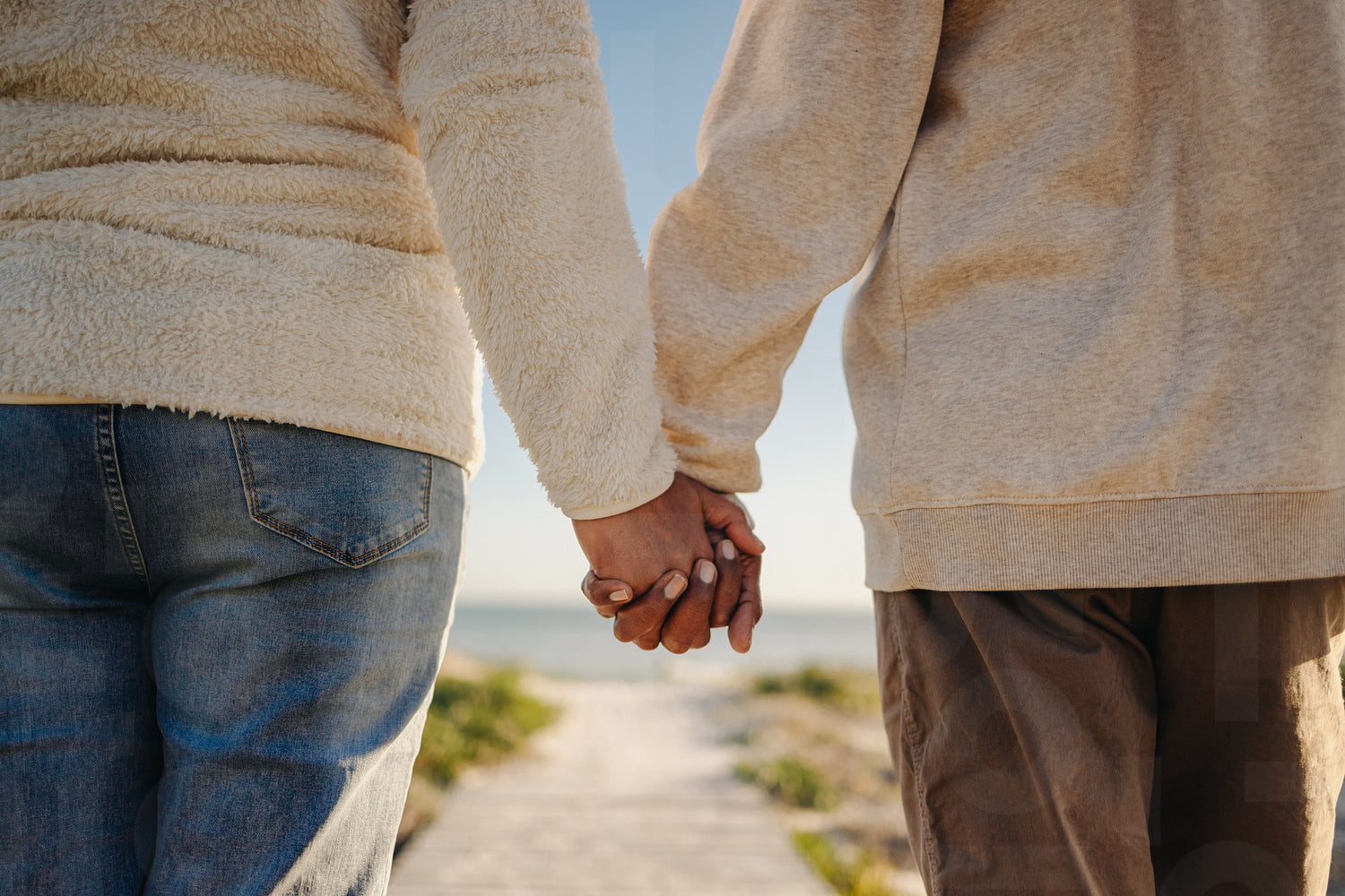 Romantic senior couple holding hands while walking down a boardwalk at the beach. Unrecognizable elderly couple taking a refreshing seaside holiday after retirement.