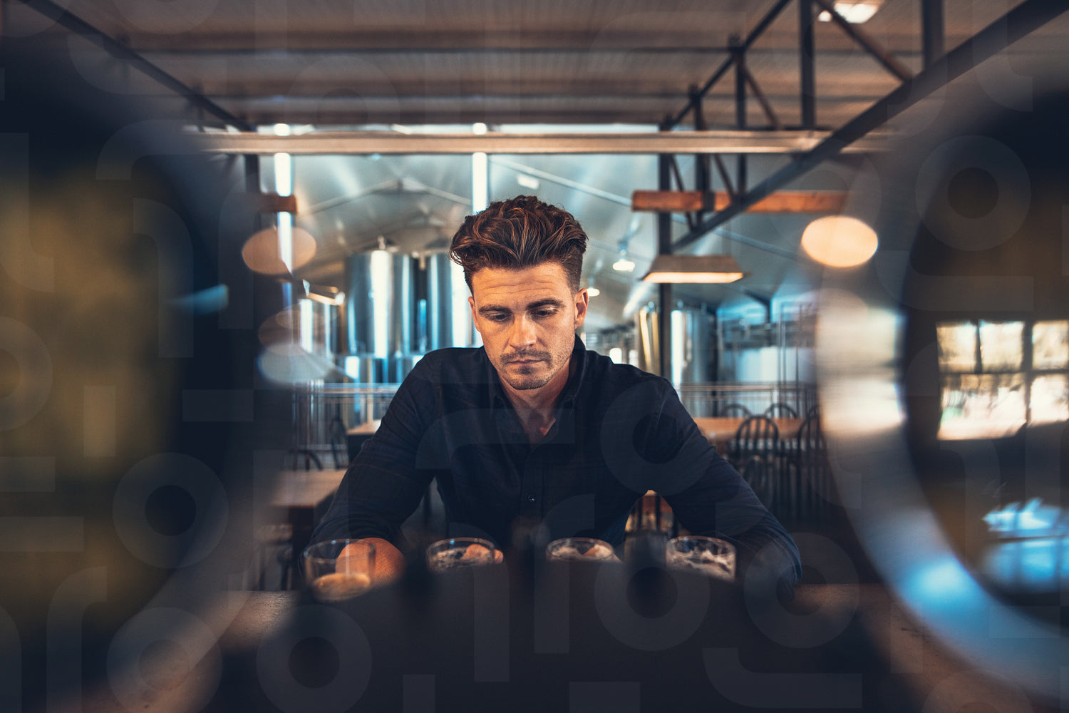 Young man sitting at brewery tasting room with different types of beers. Brewer tasting varieties of craft beers at brewery.