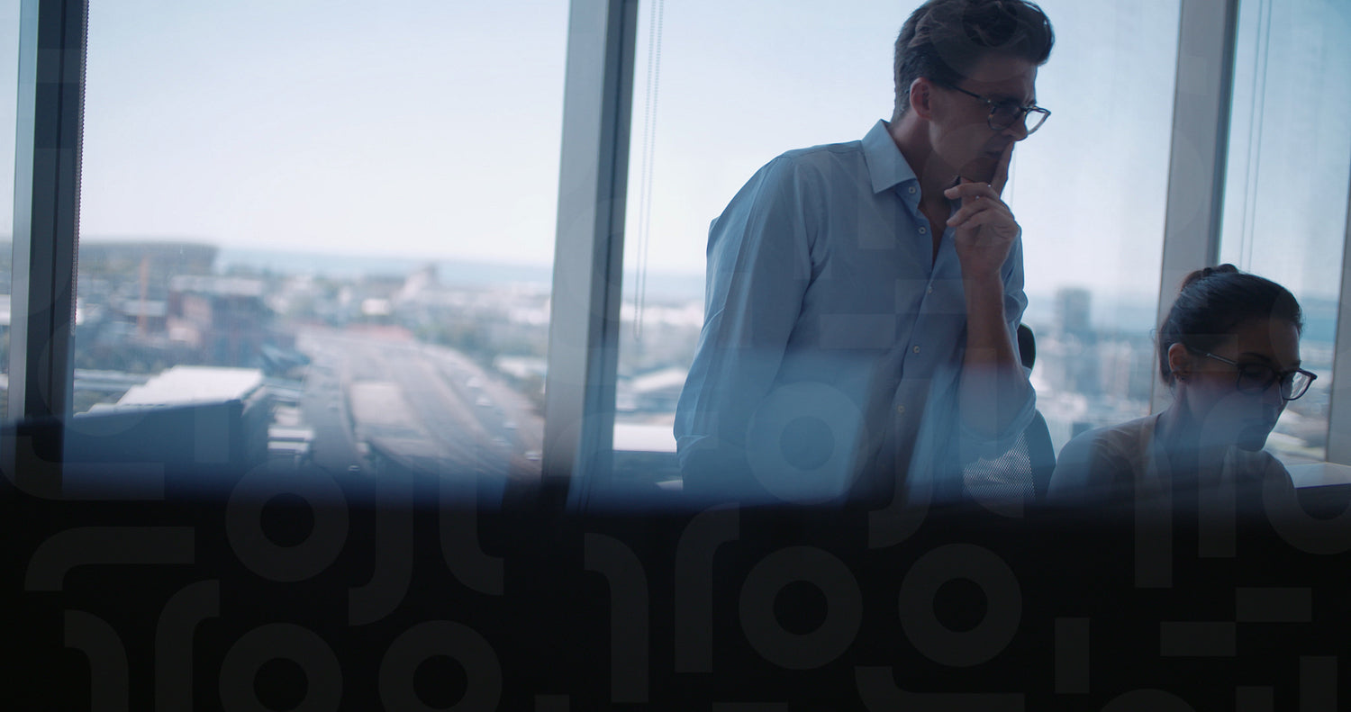 Businessman discussing with female colleague using computer at her desk. Businesspeople talking and working together in office