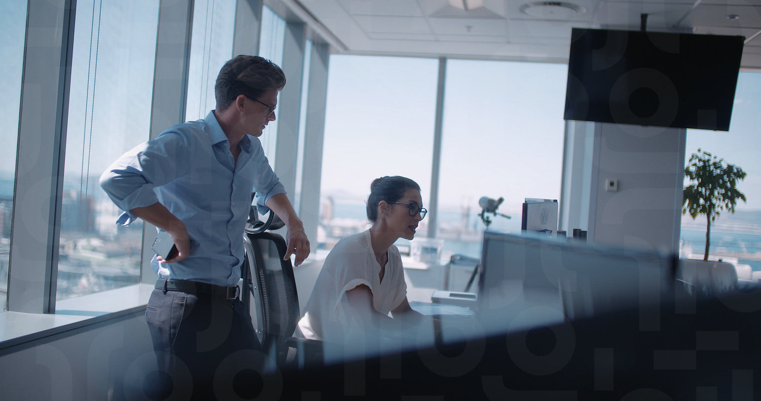 Manager talking with female colleague using computer at her desk. Business partners working together in office.