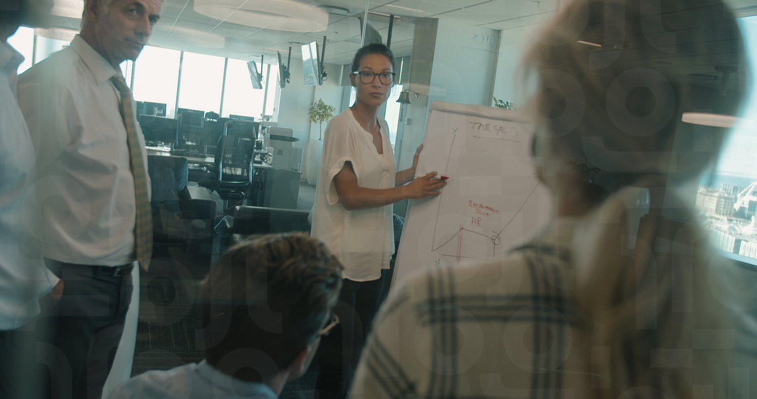 Business presentation to colleagues in office. Female executive talking with manager during meeting.