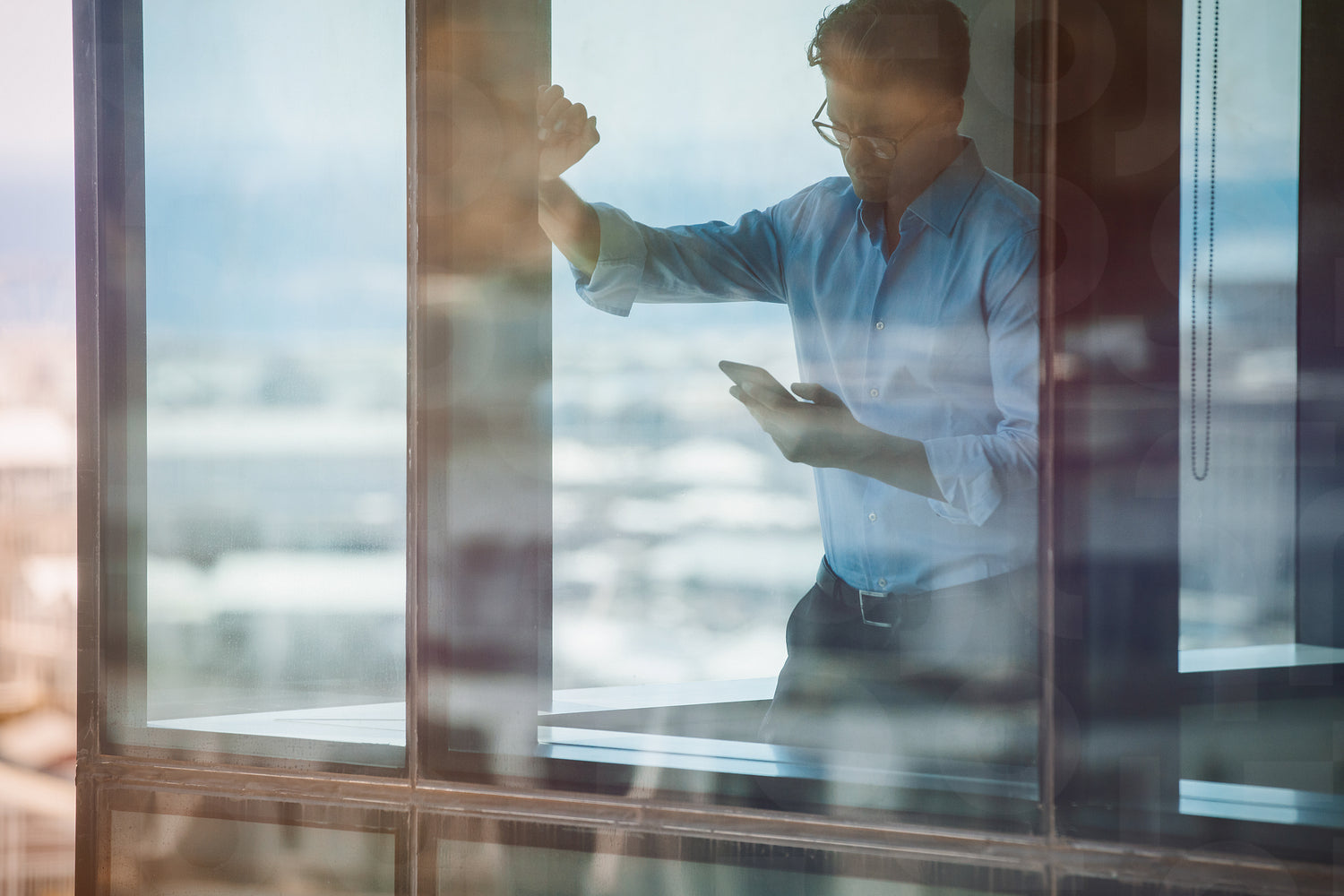 Mature businessman standing by window and reading text message on his mobile phone. Entrepreneur standing inside office building and using smart phone.
