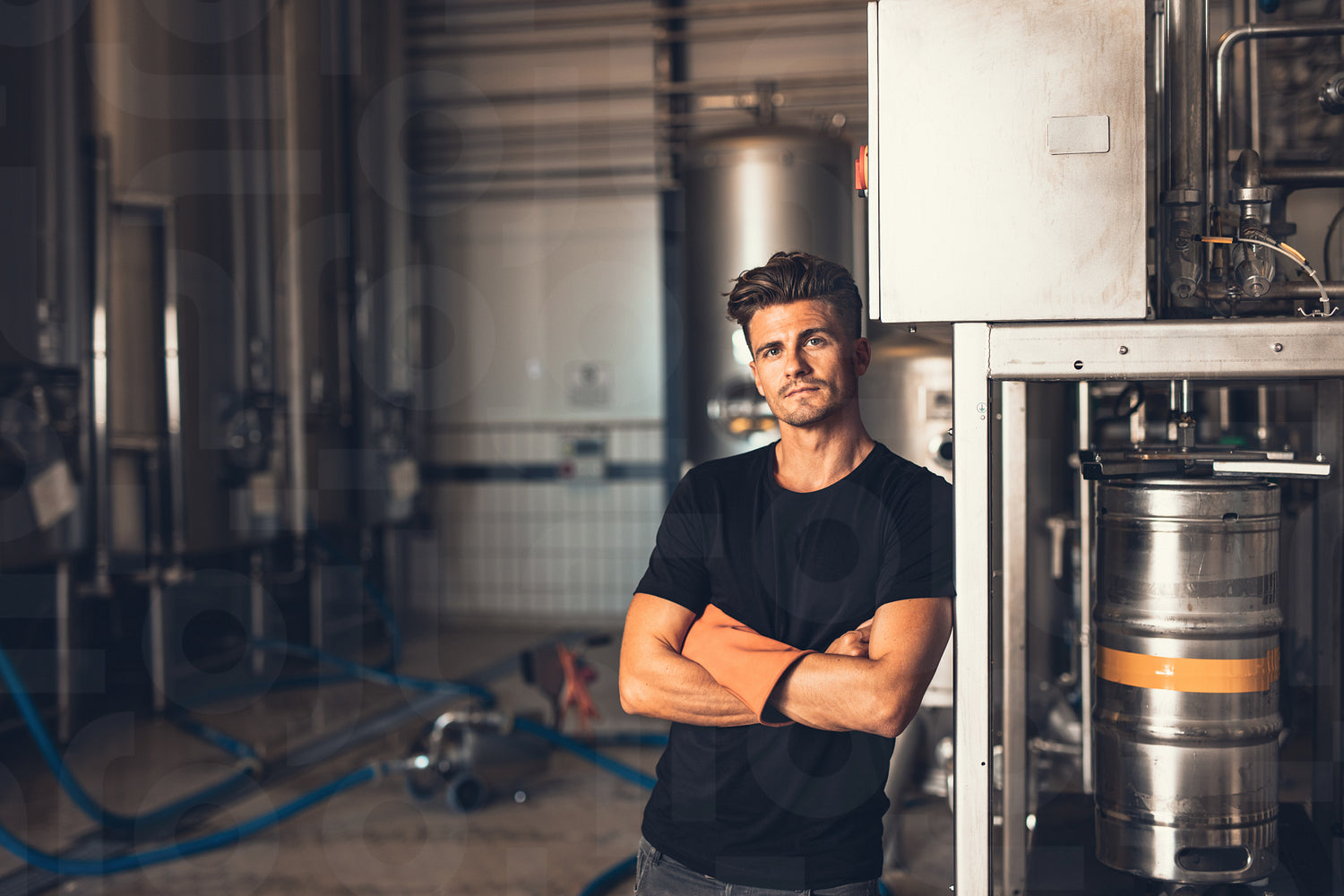 Portrait of young man standing by beer filling machine. Brewery worker with industrial equipment.