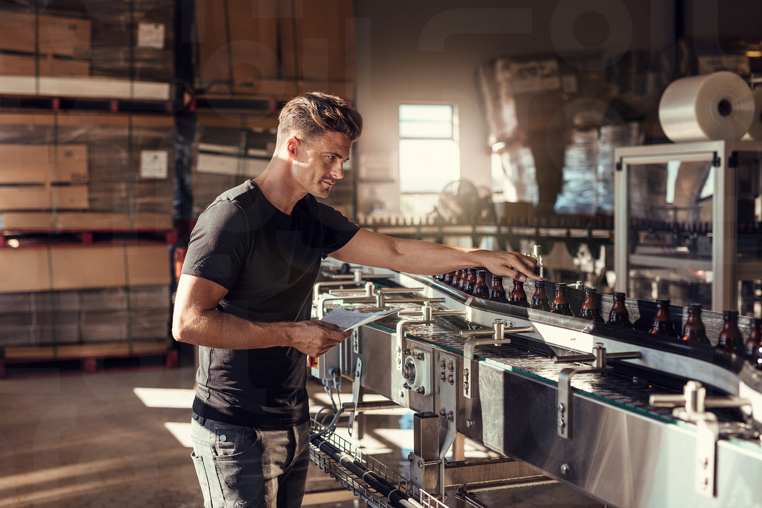 Young man supervising the beer production at brewery. Man working at alcohol manufacturing factory. His is standing near a bottling machine.