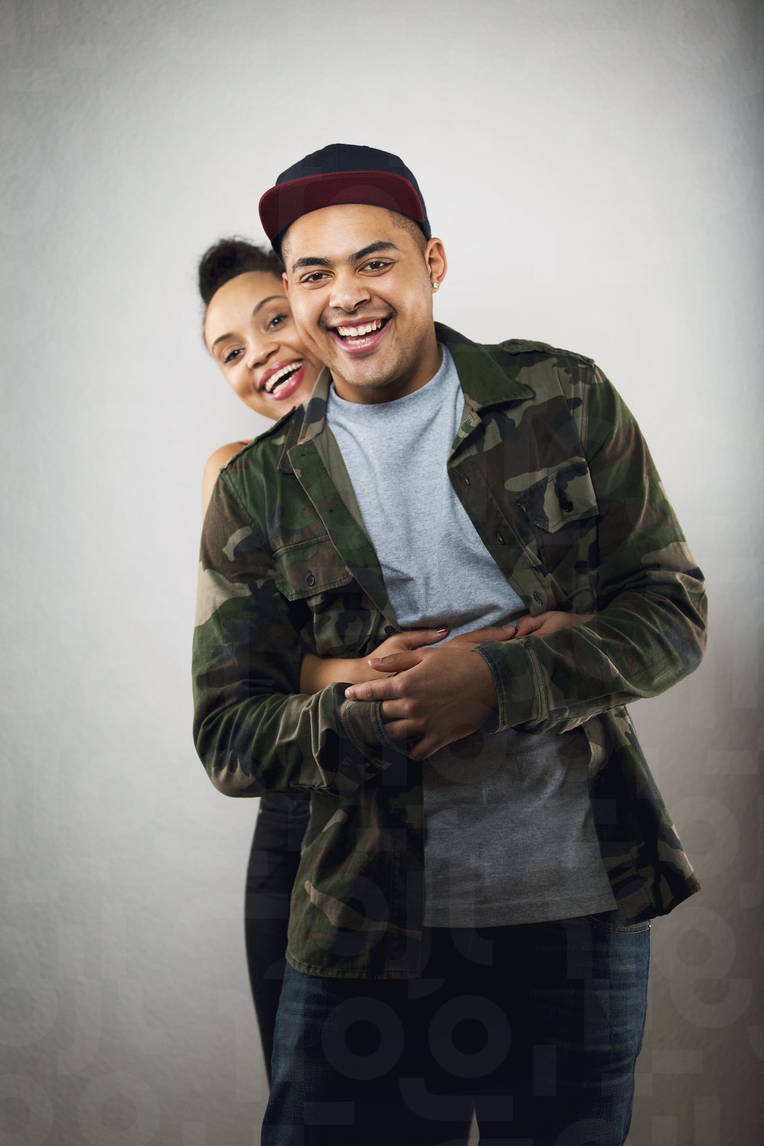 Cheerful hispanic young couple together on grey background. Young woman with her handsome boyfriend smiling at camera.
