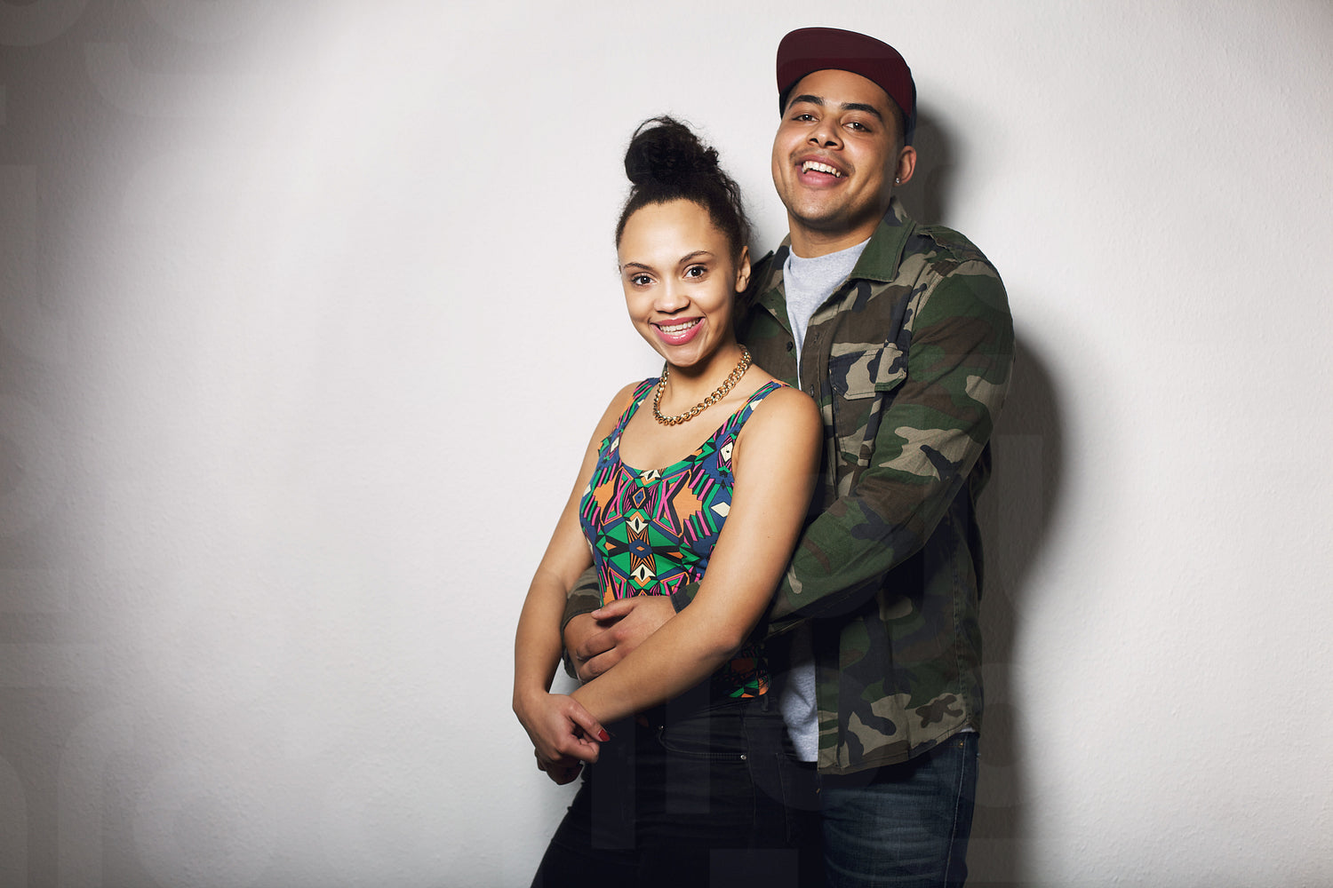 Portrait of young man and woman standing against grey background with lots of copy space. Beautiful young couple looking at camera smiling.