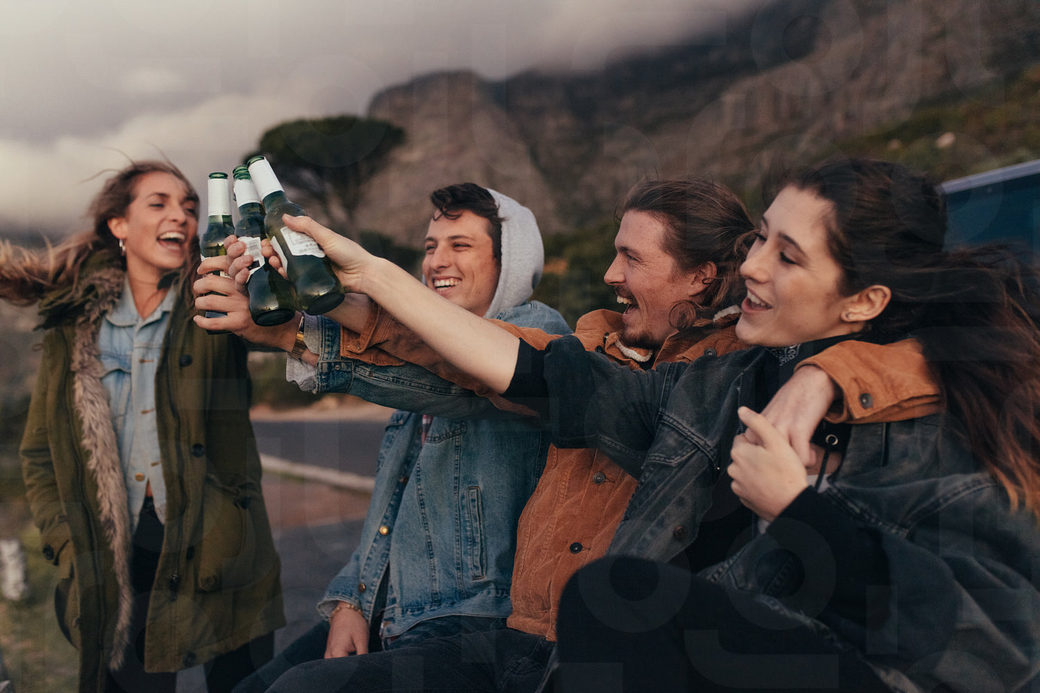 Group of friends sitting on highway toasting bottles of beer. Friends on a highway trip enjoying and partying.