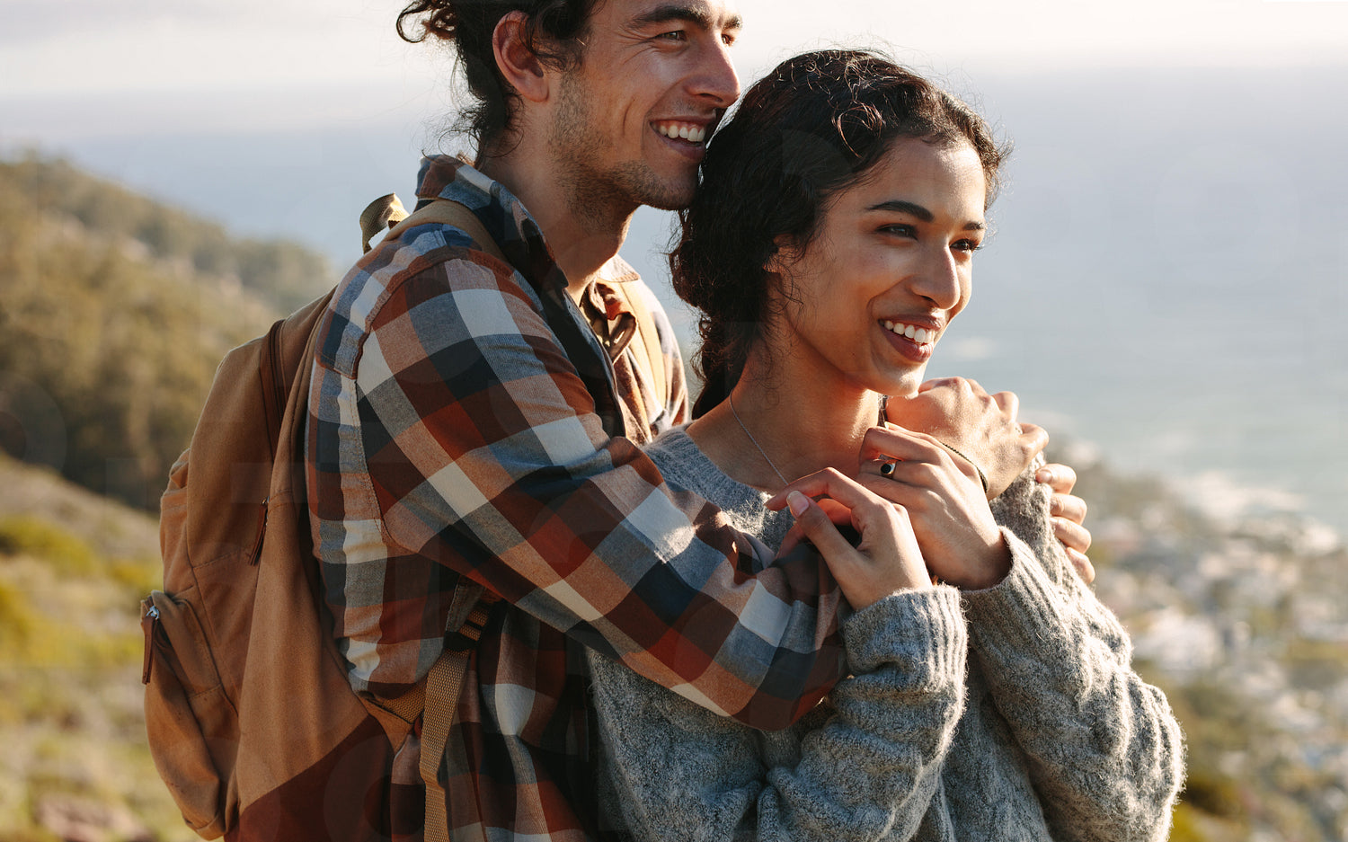 Portrait of beautiful young couple on vacation. Man and woman standing together outdoors and looking away smiling.