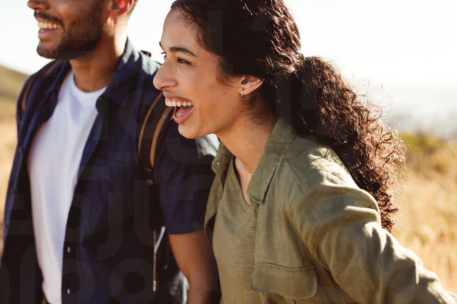 Happy couple enjoying on a holiday standing outdoors. Cropped shot of a woman laughing standing along with her boyfriend.