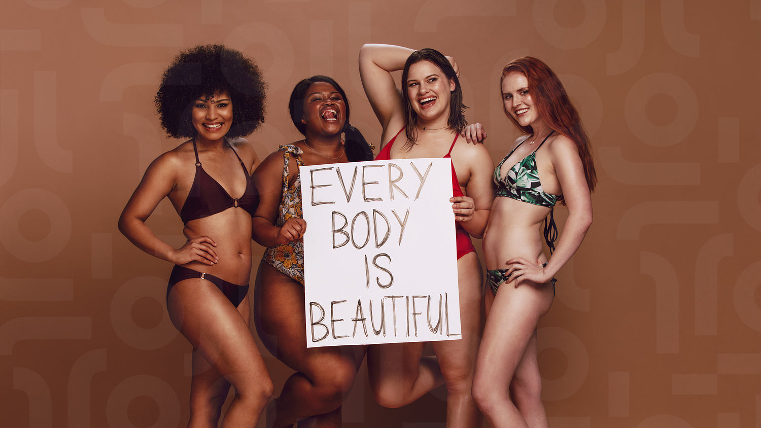 Group of different size females in swimwear holding a placard of every body is beautiful written on it against brown background.