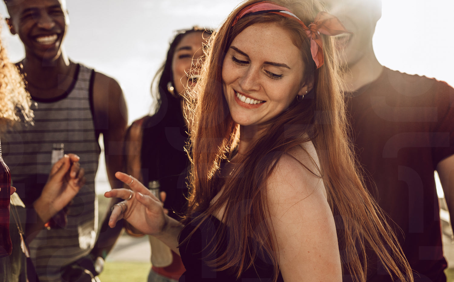 Beautiful woman dancing with friends around outdoors. Woman having a great time with group of friends on summer day.