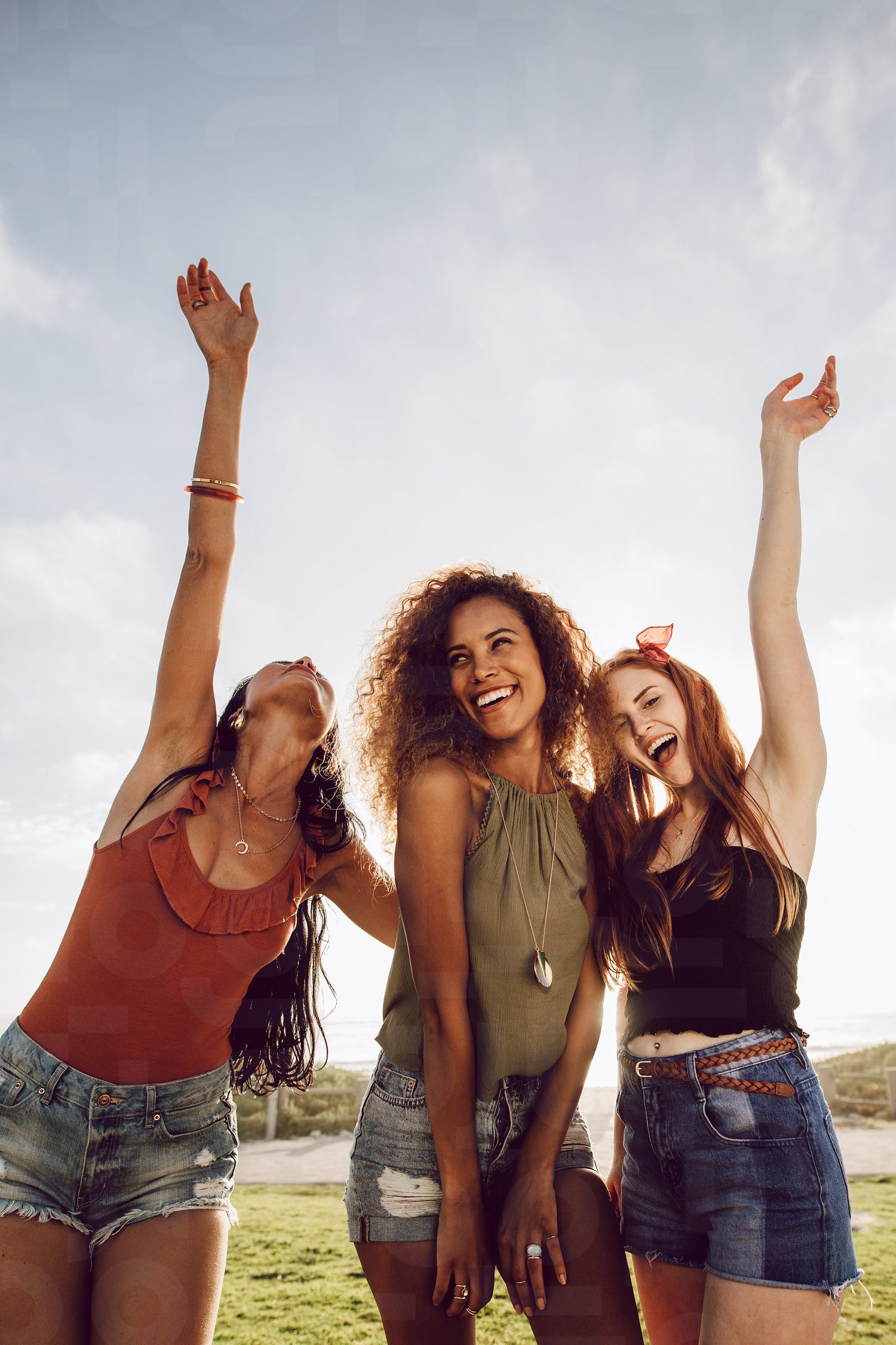 Beautiful young women standing outdoors laughing with their hand raised. Carefree girls enjoying themselves on summer holiday.