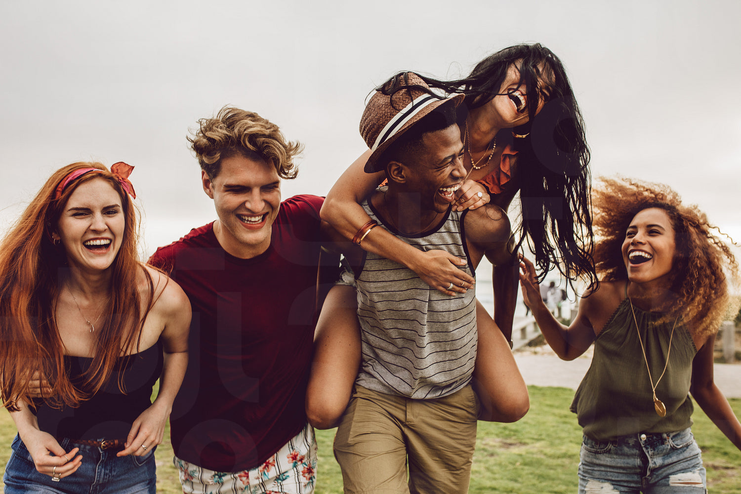 Multiracial group of friends hanging out and having fun outdoors. Young men and women enjoying outdoors on summer day.