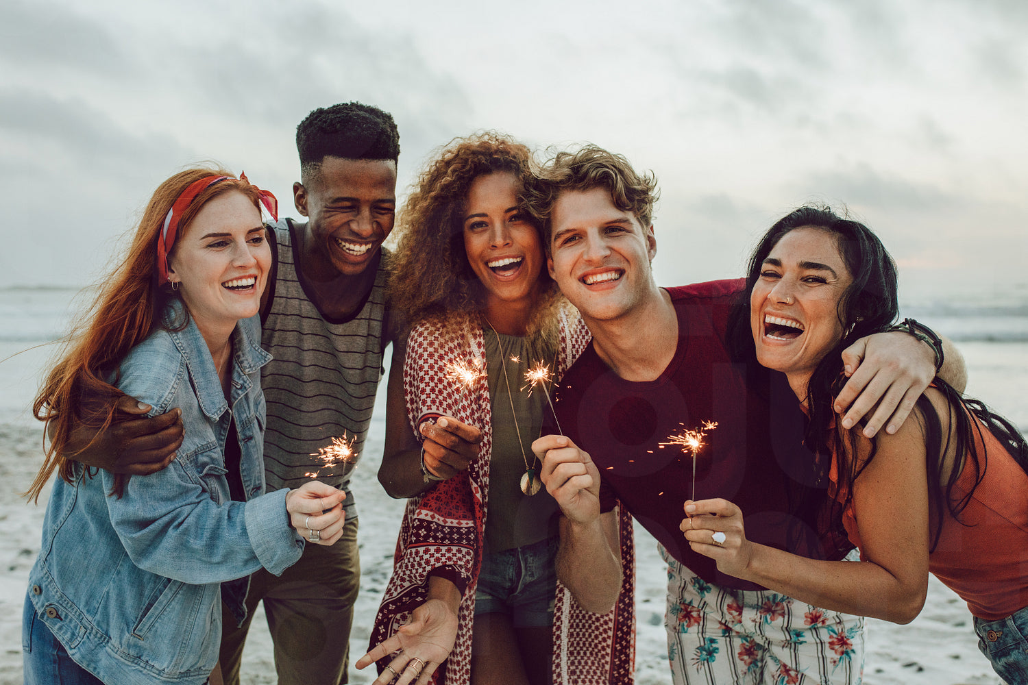 Multiracial friends enjoying at beach with sparklers