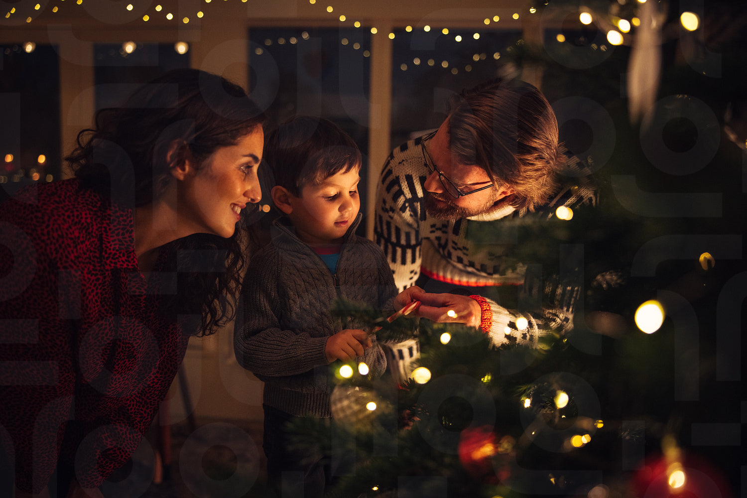 A boy looking at the lights on the Christmas tree together with his parents standing by. Boy holding a candy cane to hang on Christmas tree at home.