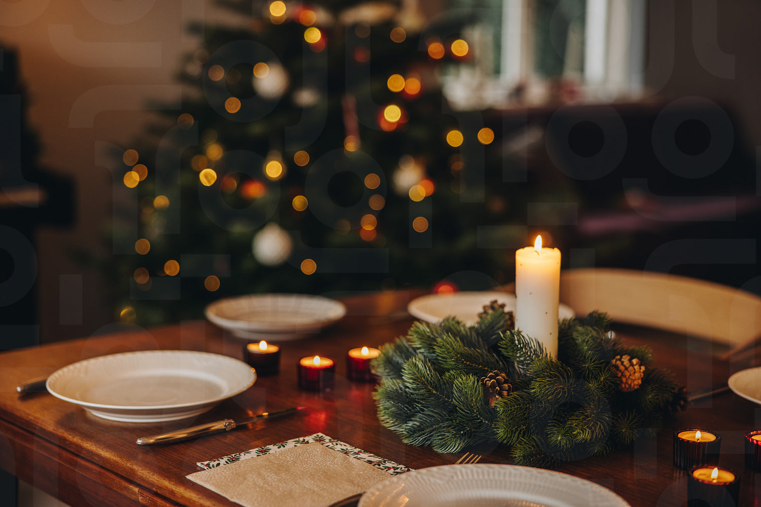 Christmas candles in advent wreath with plates on dinner table. Scandinavian home decorated for Christmas dinner.