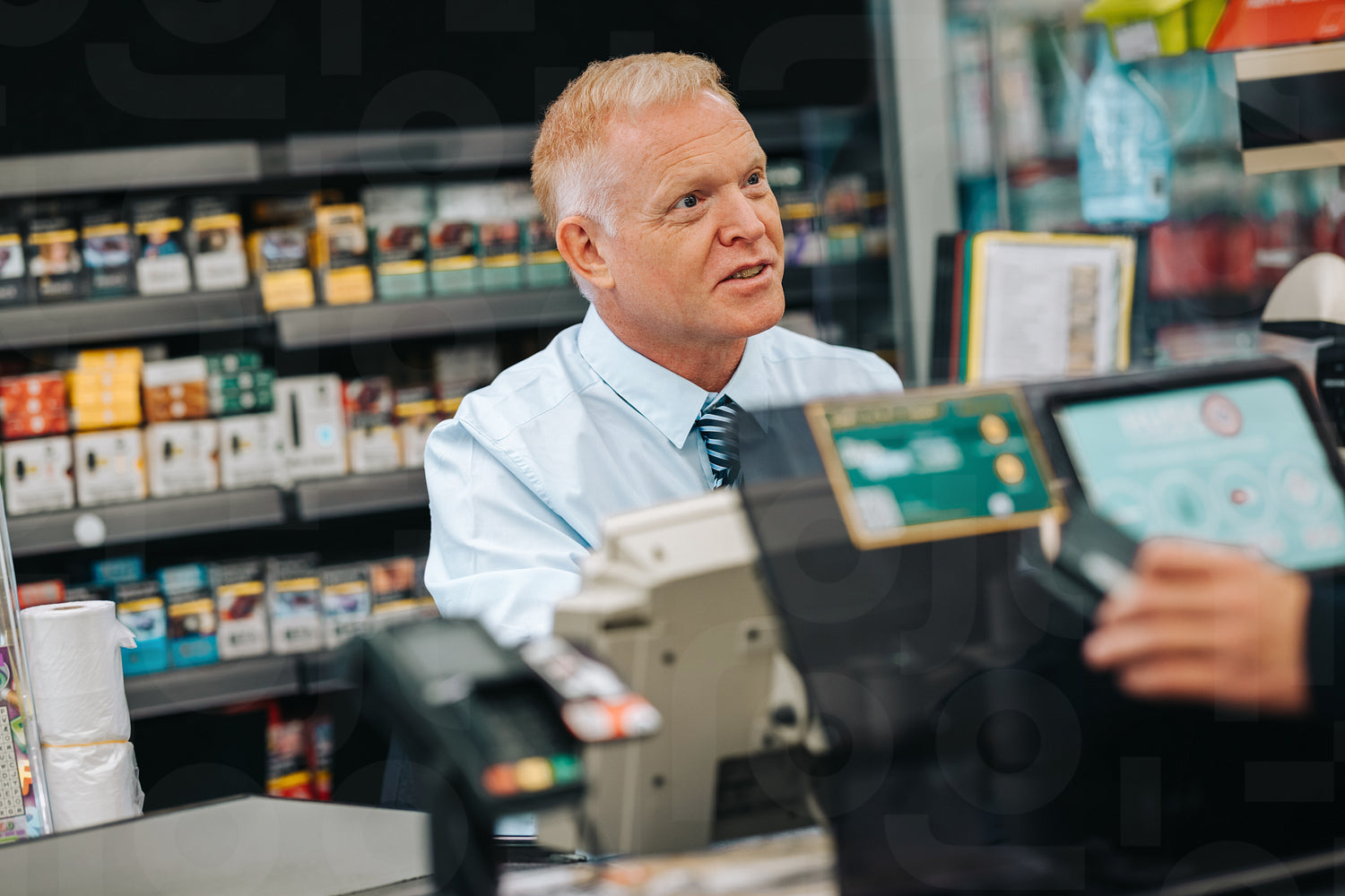 Senior man working at supermarket checkout counter. Cashier talking with a customer making credit card payment at grocery store.