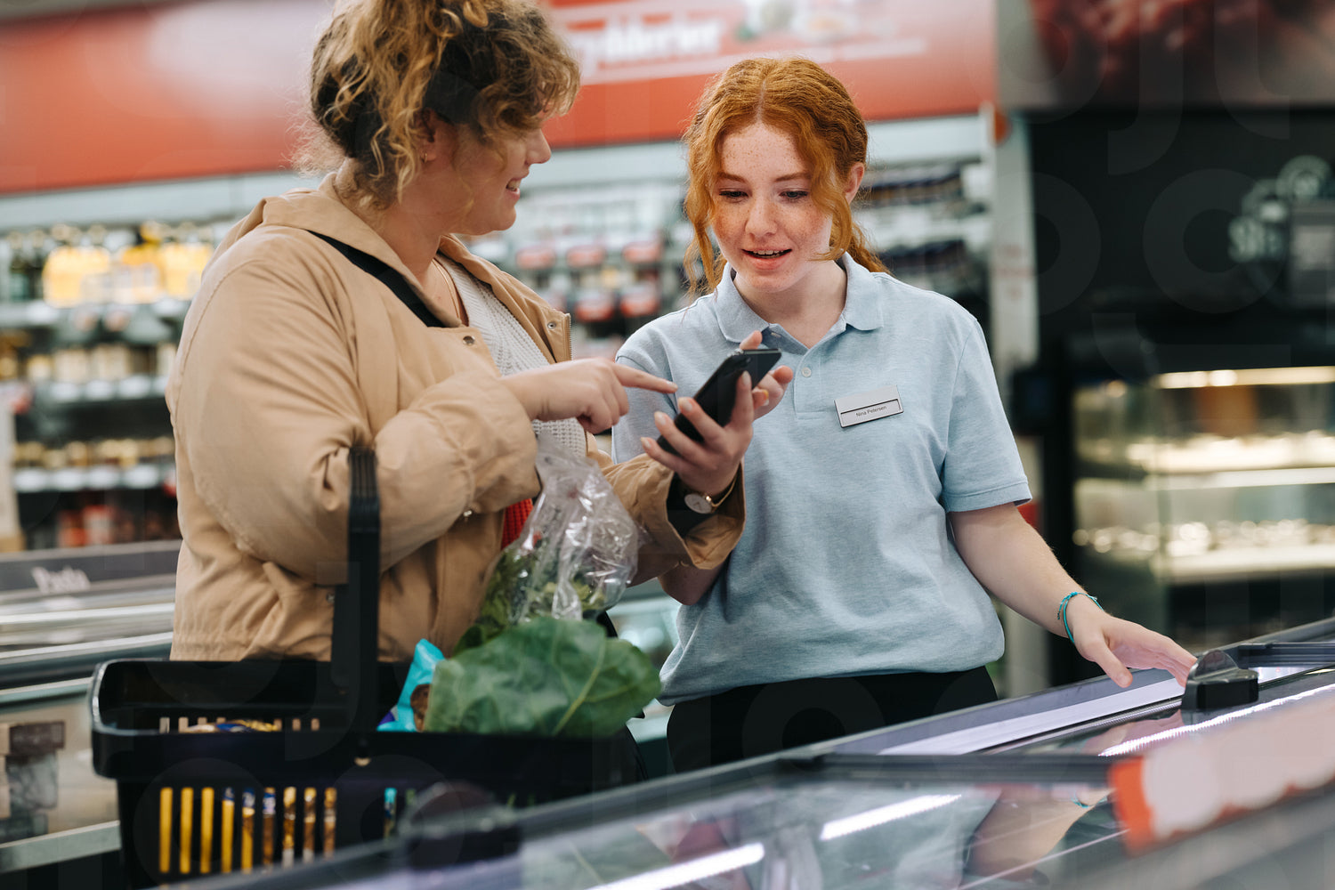 Grocery store worker assisting female shopper. Female customer showing her mobile phone to store assistant and asking for the product at supermarket.